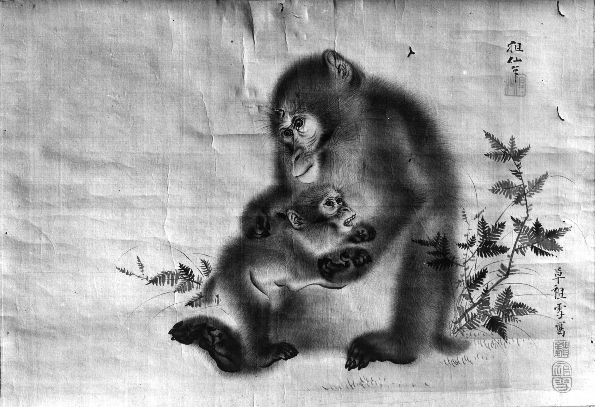 Dipinto con montatura yamato raffigurante una scimmia seduta nell'erba con in braccio il suo scimmiotto