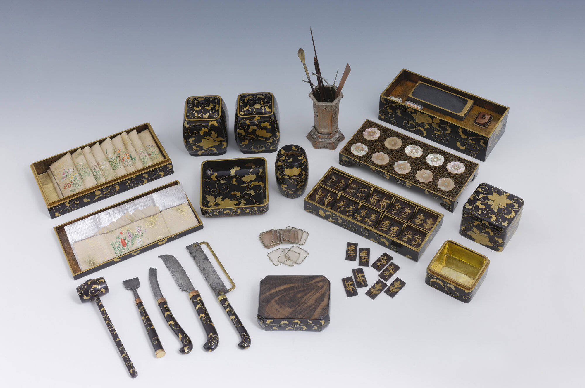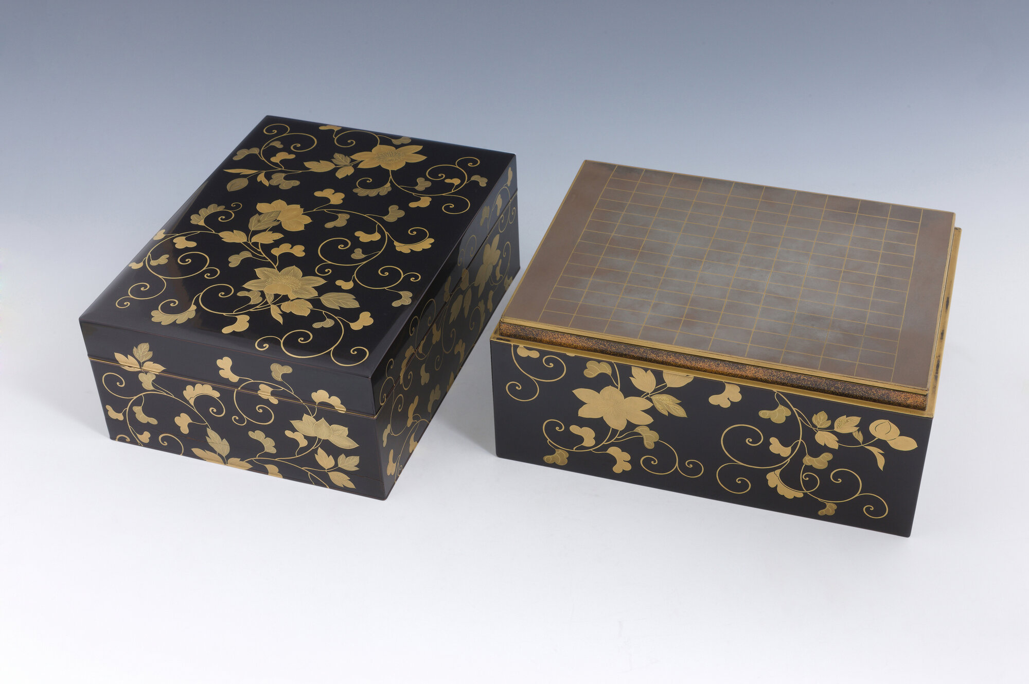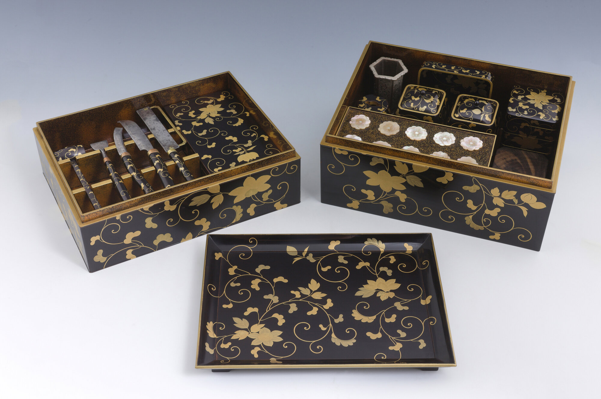 La scatola (jūshu-kōbako) è formata da due scomparti sovrapposti e da un coperchio. Al suo interno contiene tutto il vasellame e gli utensili occorrenti per la cerimonia degli incensi. Il recipiente è decorato esternamente con motivi vegetali eseguiti a polvere d'oro su fondo in lacca nera