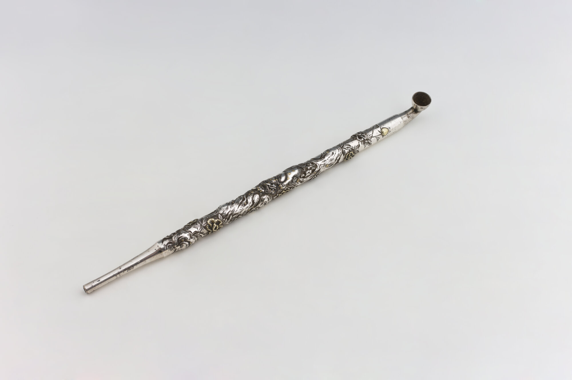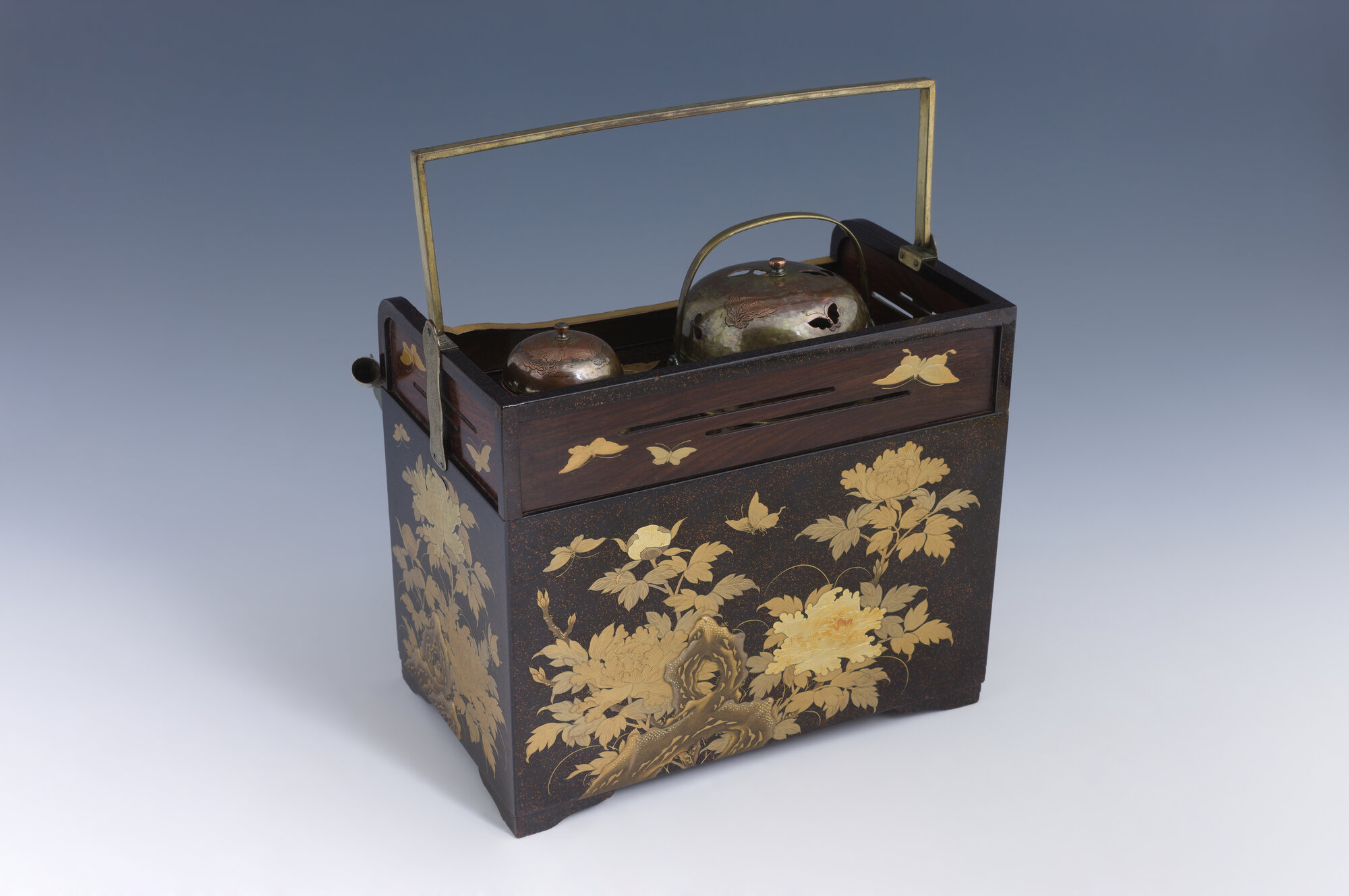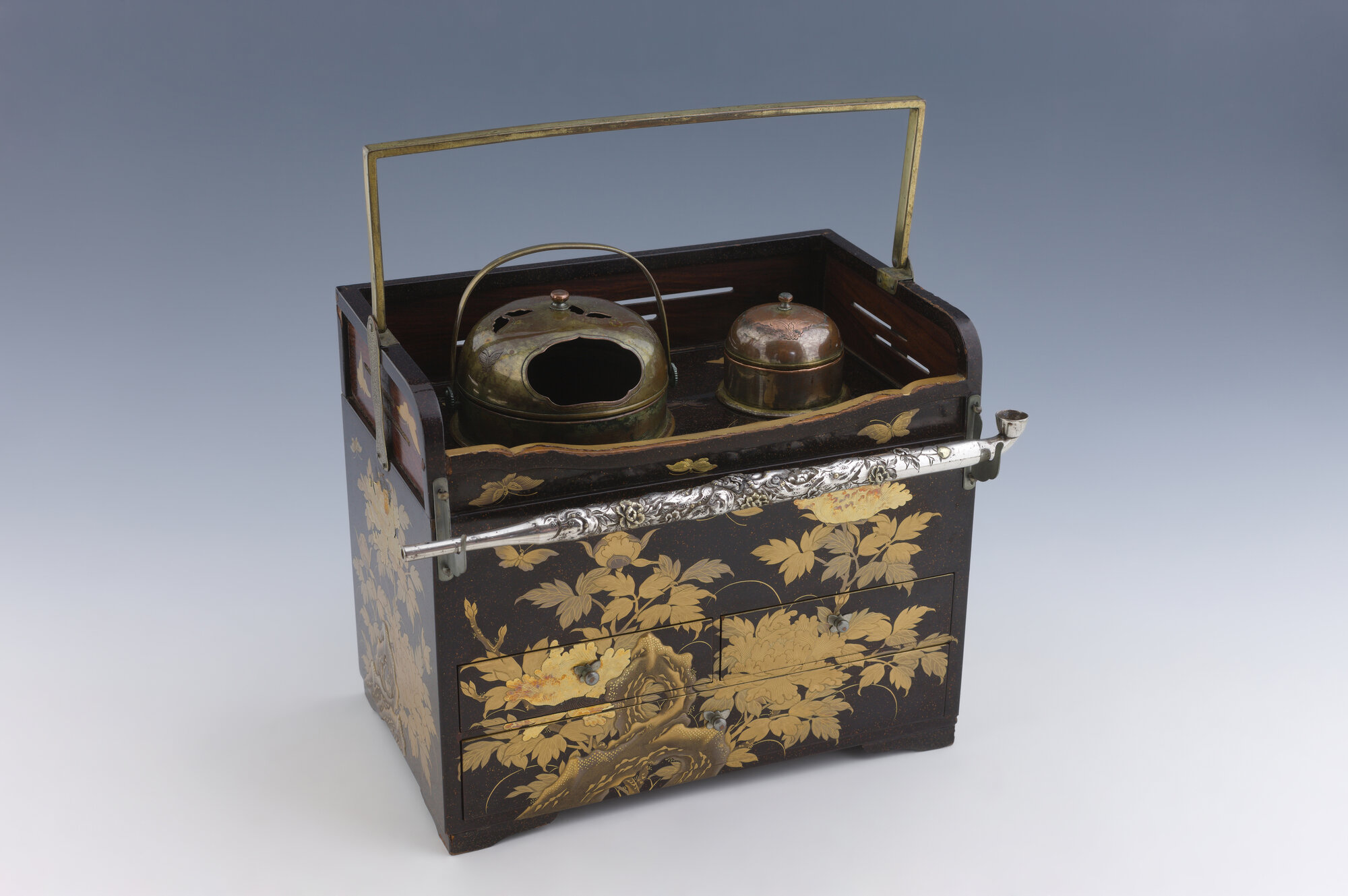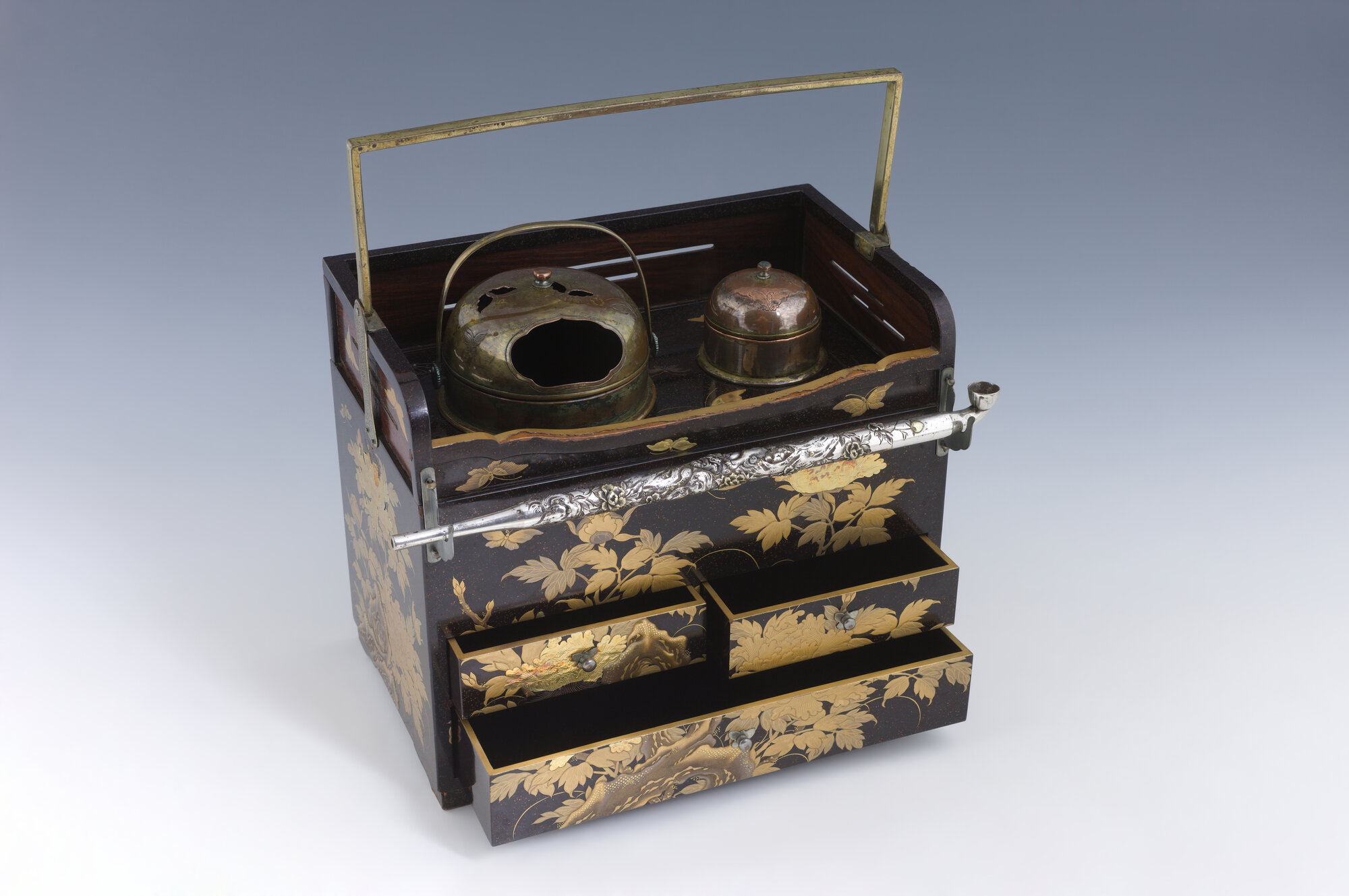 Servizio da fumo (tabakobon) composto da uno stipetto a tre cassetti con piedini a mensola, ripiano a sponde ritte con bracierino e portacenere in metallo, pipa in argento fuso cesellato. La decorazione dorata è campita su fondo nero e raffigura piante di peonia in rigogliosa fioritura presso sassi forati e farfalle svolazzanti. Questi motivi sottolineano il significato voluttuario e sociale del fumo di tabacco