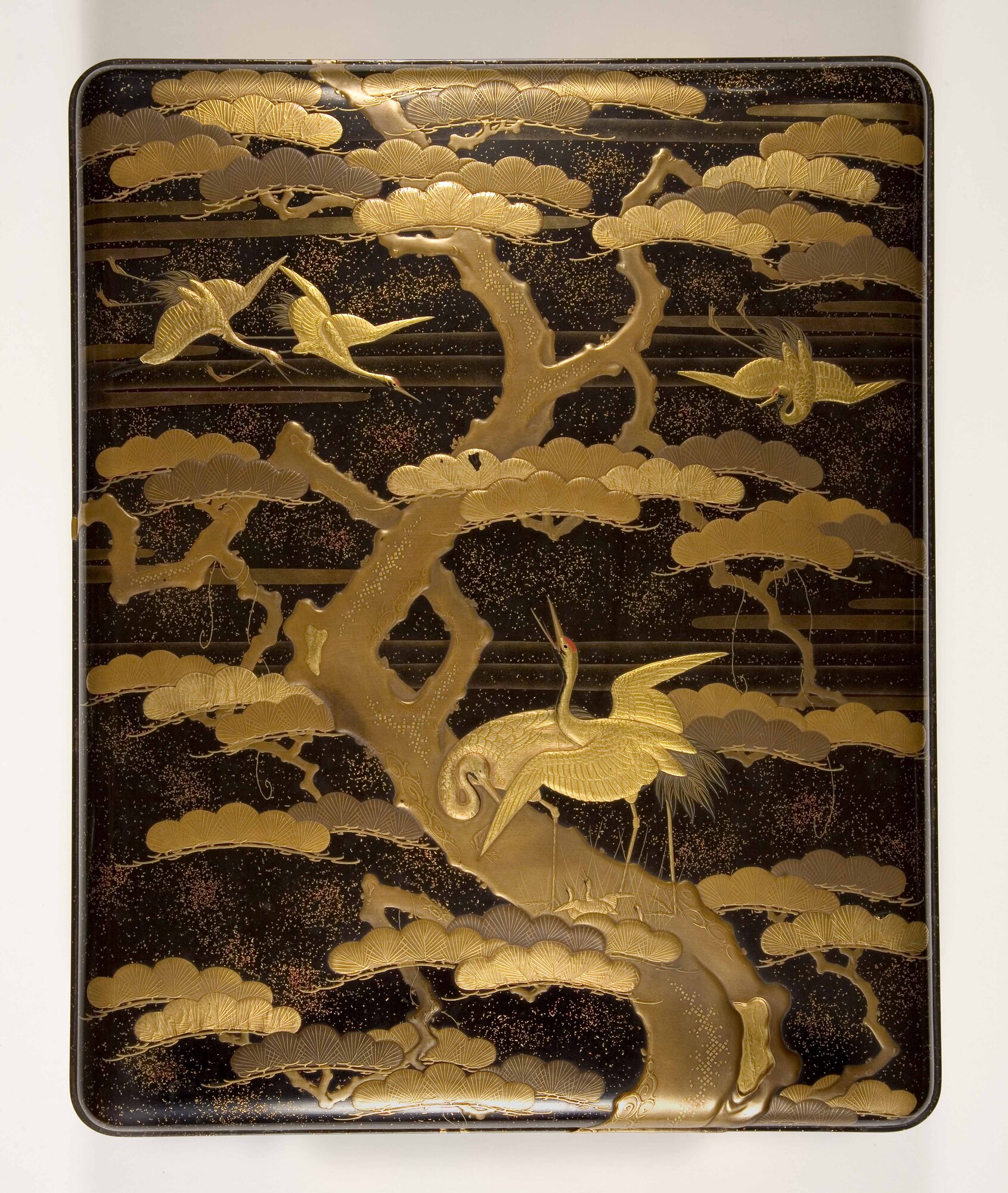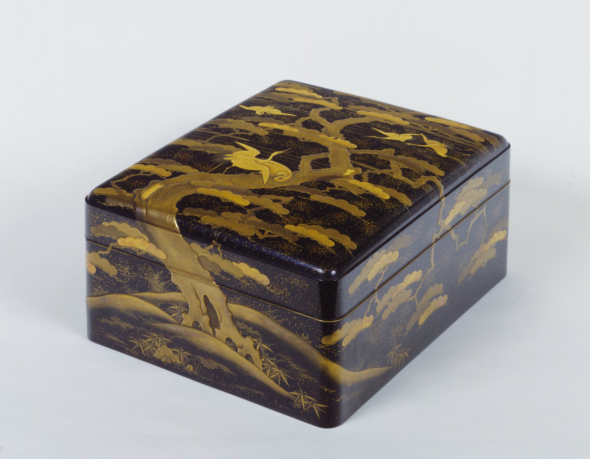 Scatola porta cancelleria di forma rettangolare a spigoli stondati. Il coperchio è leggermente convesso, con margine da polvere. Sullo sfondo di banchi di nebbia si staglia un grande pino contorto e cinque gru, tre in volo e due posate sul tronco.In Estremo Oriente la gru è considerata un uccello di età millenaria, messaggero e veicolo degl'Immortali, e viene spesso rappresentata in associazione ai tre alberi susino, pino e bambù, detti "i tre amici dell'inverno", e, come in questo caso, alla vecchissima tartaruga con il carapace coperto di alghe, rappresentata all'interno del coperchio