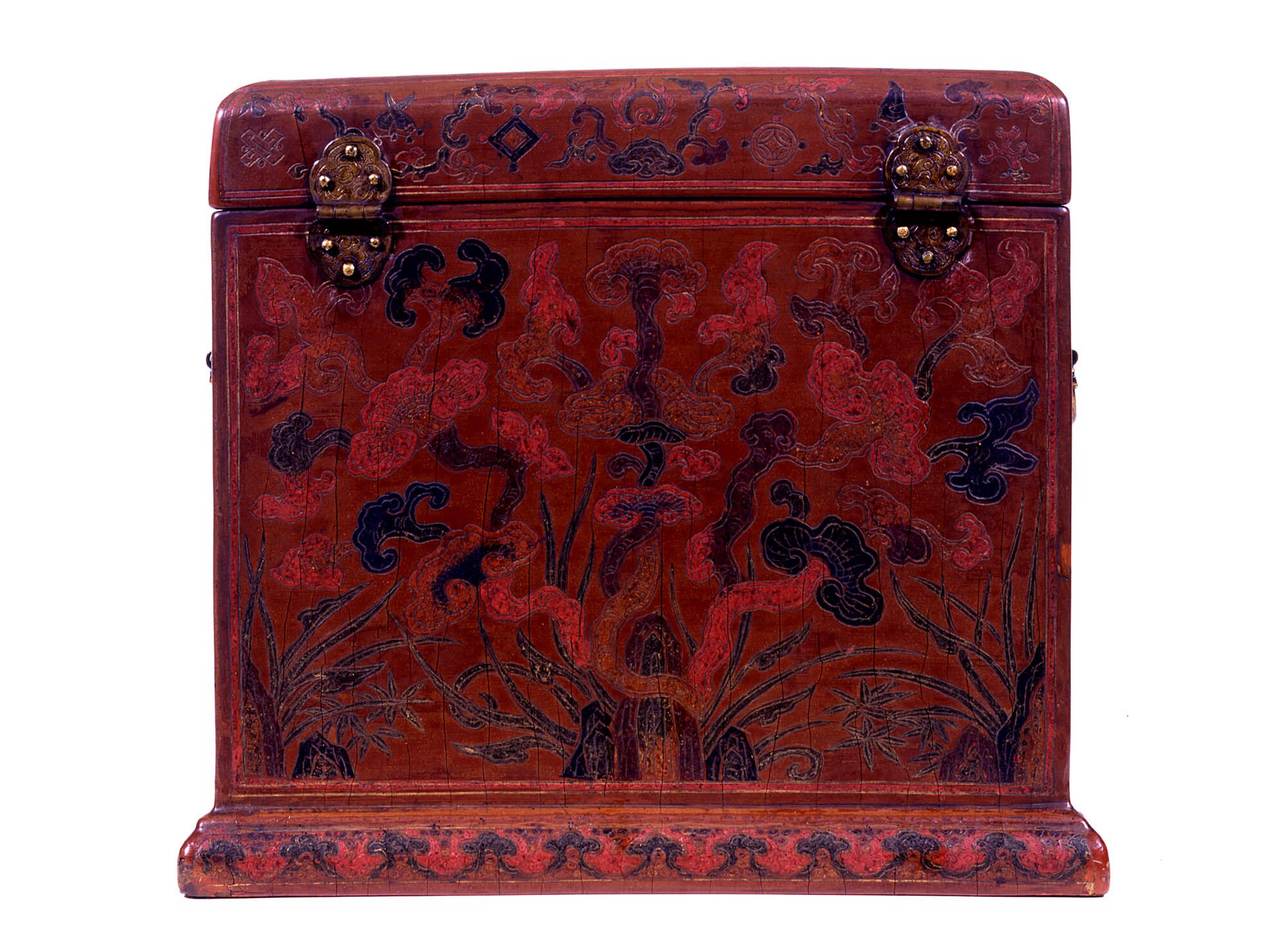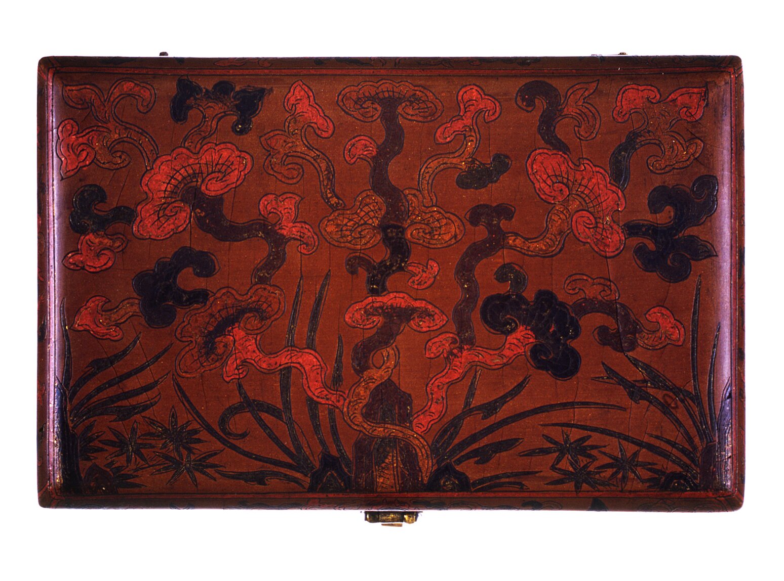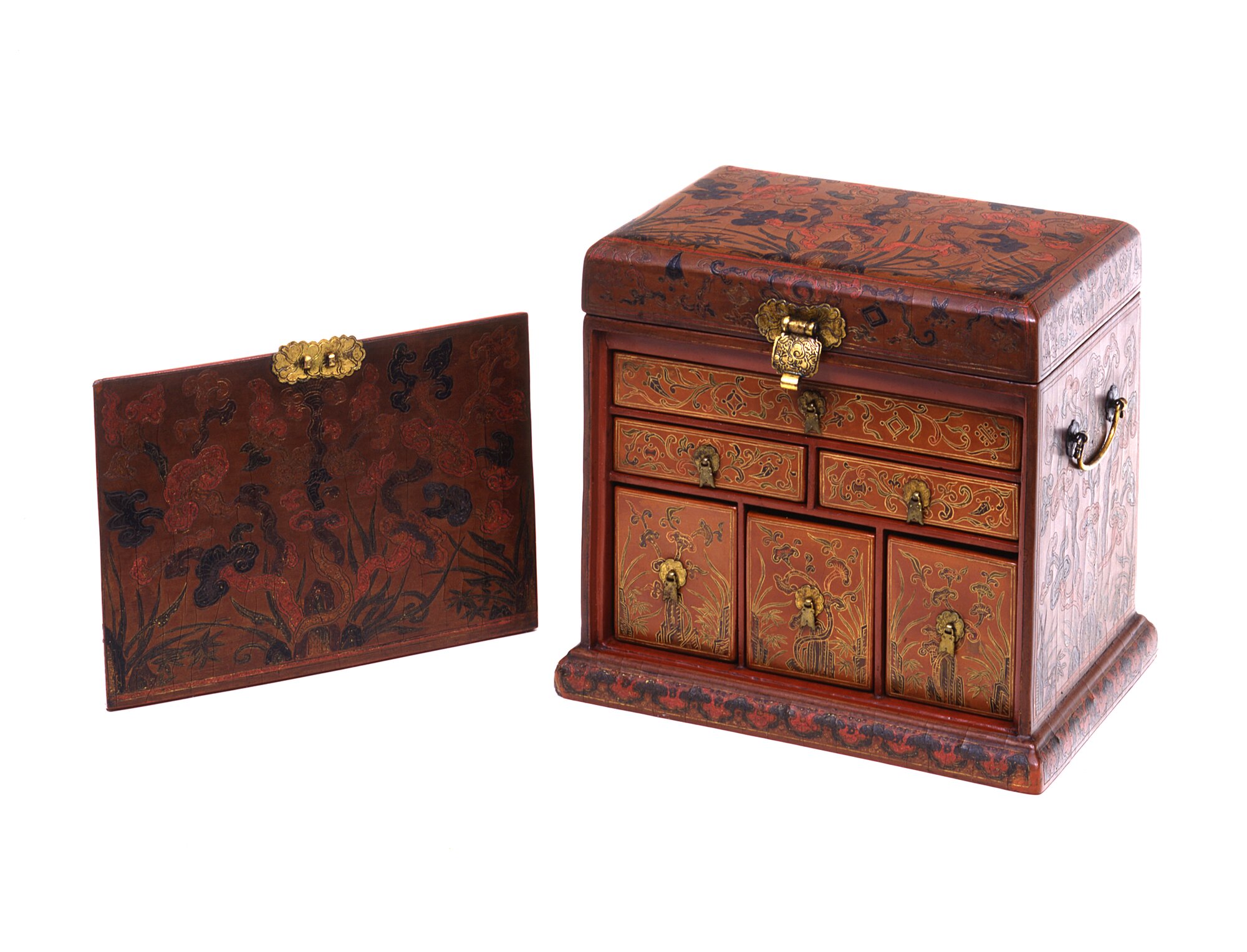 Stipetto portatile (tansu) a forma di parallelepipedo con coperchio a spigoli stondati, base aggettante bombata, antina estraibile e sei cassettini all'interno. Cardini, presine dei cassetti, manigliette laterali e borchie sono in bronzo inciso e dorato. La decorazione consta di elementi vegetali stilizzati: rocce,funghi lingzhi e orchidee sull'esterno e sulla fronte dei cassettini, serpentine vegetali con emblemi di prosperità infiocchettati ai lati del coperchio, doppia fila di teste di ruyi alternatamente rivolte in alto e in basso alla base