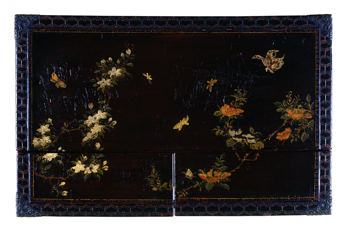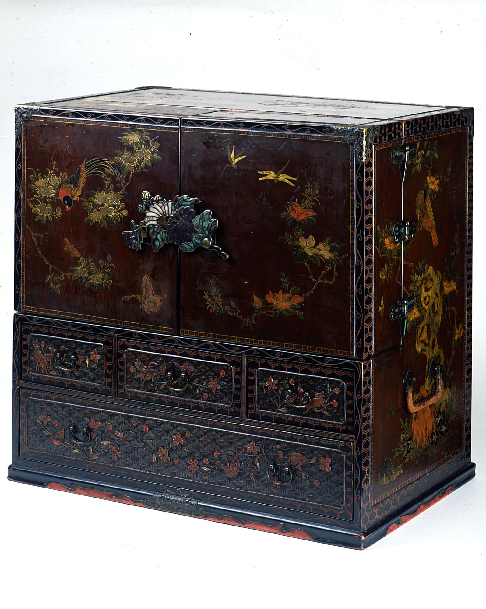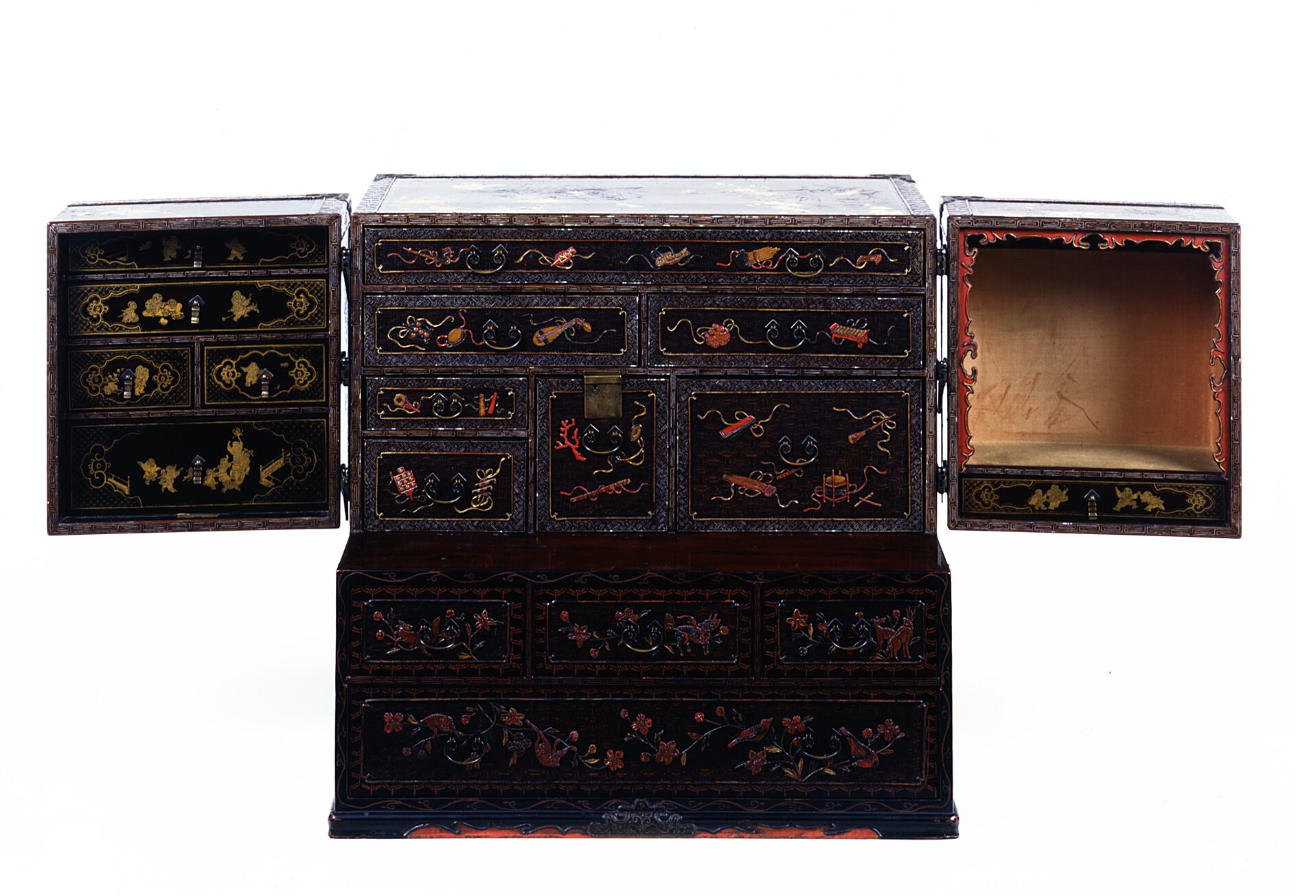 Stipo a doppio corpo (kasane-dansu) a forma di parallelepipedo con base aggettante a piede mistilineo. La porzione inferiore si articola in quattro cassetti mentre quella superiore presenta sei tiretti, chiusi da due ante attrezzate. Il battente di destra ospita cinque cassettini chiusi da un coperchio estraibile mentre quella di sinistra include un vano attrezzato con ganci portachiavi e un ulteriore cassettino alla base. Le maniglie laterali da trasporto hanno forma rettangolare stondata e sono rivestite in cuoio. Le maniglie dei cassetti sono invece a germoglio di felce. I pomoli del coperchio estraibile e dei cassettini delle antine possiedono ciondoli. I cardini in bronzo hanno forma di libellula e di farfalla e sono decorati con smalti colorati. La chiusura esterna delle ante avviene per mezzo di un paletto orizzontale girevole in bronzo decorato a smalti colorati che simula uno stelo reciso di crisantemo con foglie e fiori. L'arredo presenta rinforzi angolari in metallo brunito. L'esterno è arricchito da scene popolate da uccelli esotici, insetti e fiori nella caratteristica ambientazione di sassi forati, erbe, orchidee, funghi. Sui quattro cassetti del corpo inferiore compaiono tralci di clematide con cervi, unicorno, lepre, uccelli e scimmie mentre sui sette cassetti del corpo superiore sono sparsi venti diversi strumenti musicali.Nonostante l'impronta stilistica cinese sia estremamente evidente, la decorazione in pasta di lacche colorate sembrerebbe fornire un orientamento ruykyuanense: si potrebbe ipotizzare che questo manufatto sia una produzione speciale per il mercato cinese, di cui riflette il gusto in alcuni elementi decorativi