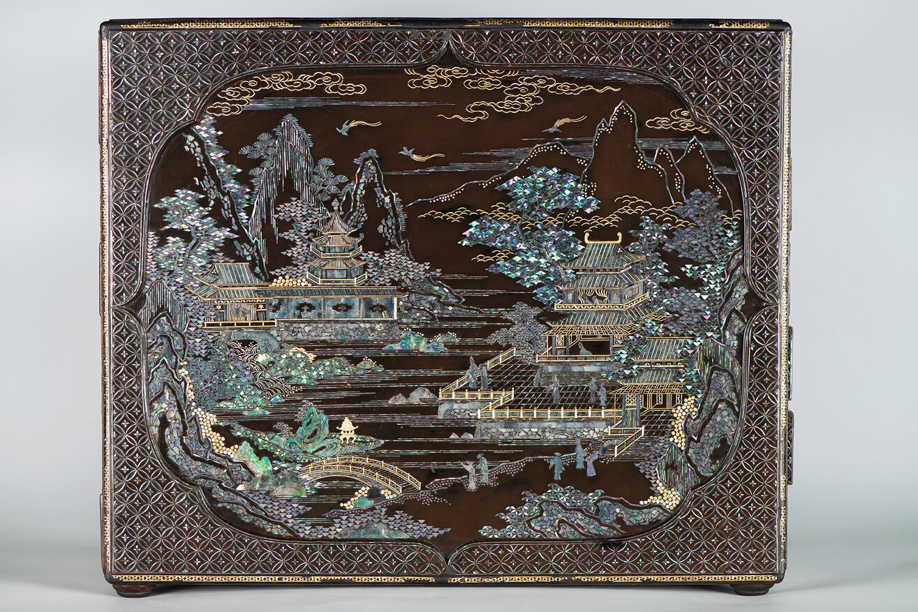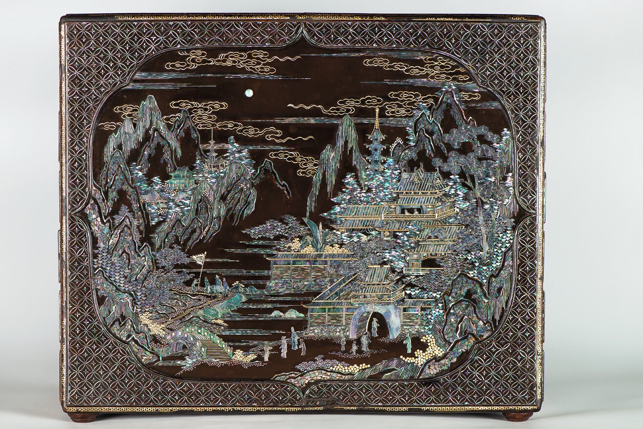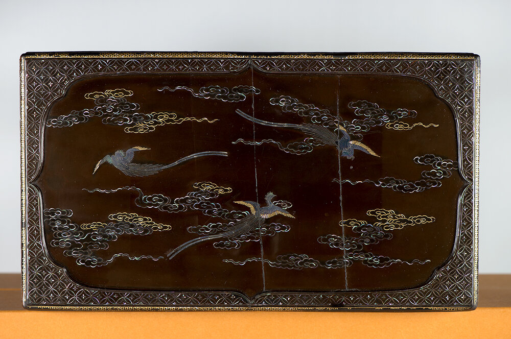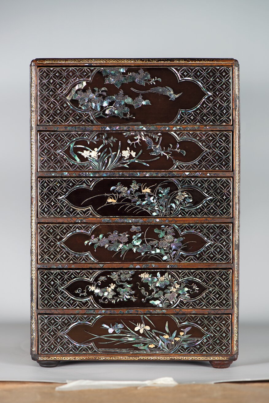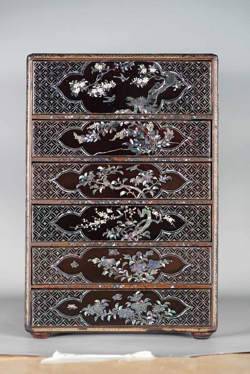 Stipetto per astucci porta-medicine (inrōdansu) a forma di parallelepipedo con piedini a mezza noce e base a tavoletta. Possiede sei cassetti a due fronti scorrevoli bilateralmente. La raffinata decorazione si estende su tutte le superfici. Sui lati principali troviamo un fondo shippō-tsunagi che incornicia delle formelle ribassate a quattro lobi appuntiti, all'interno delle quali compaiono due vedute - una diurna e una notturna - con palazzi, pagode e padiglioni sull'acqua, rocce, rilievi, vegetazione e piccole figure. Sulla fronte dei cassetti il medesimo sfondo definisce dodici formelle lobate a doppia punta all'interno delle quali sono rappresentate diverse essenze floreali. Sul lato superiore troviamo fenici in volo tra nubi