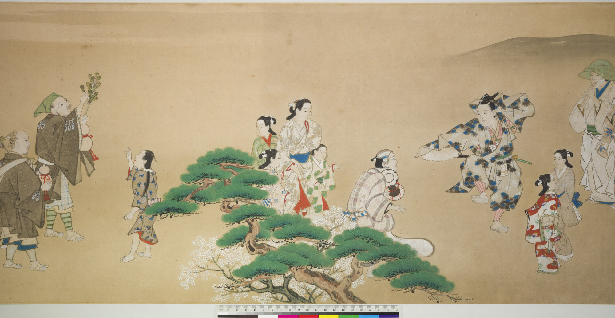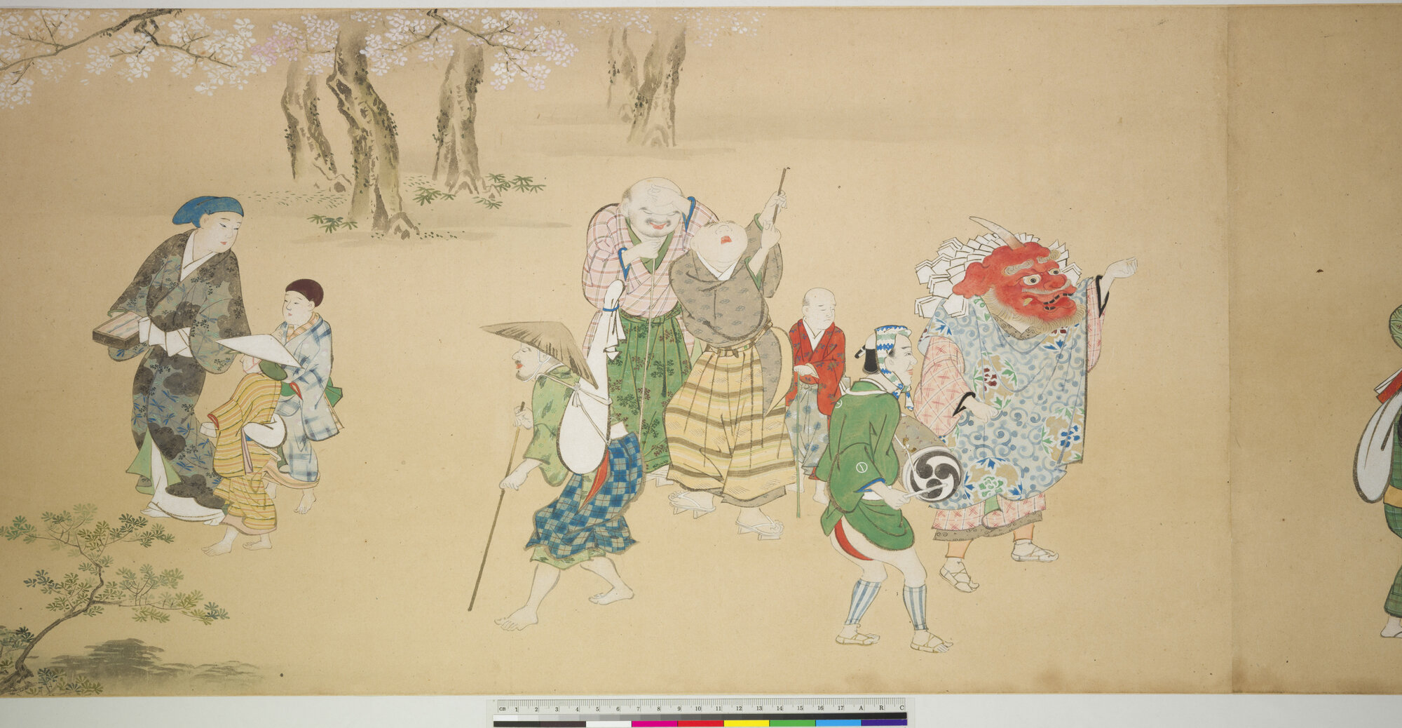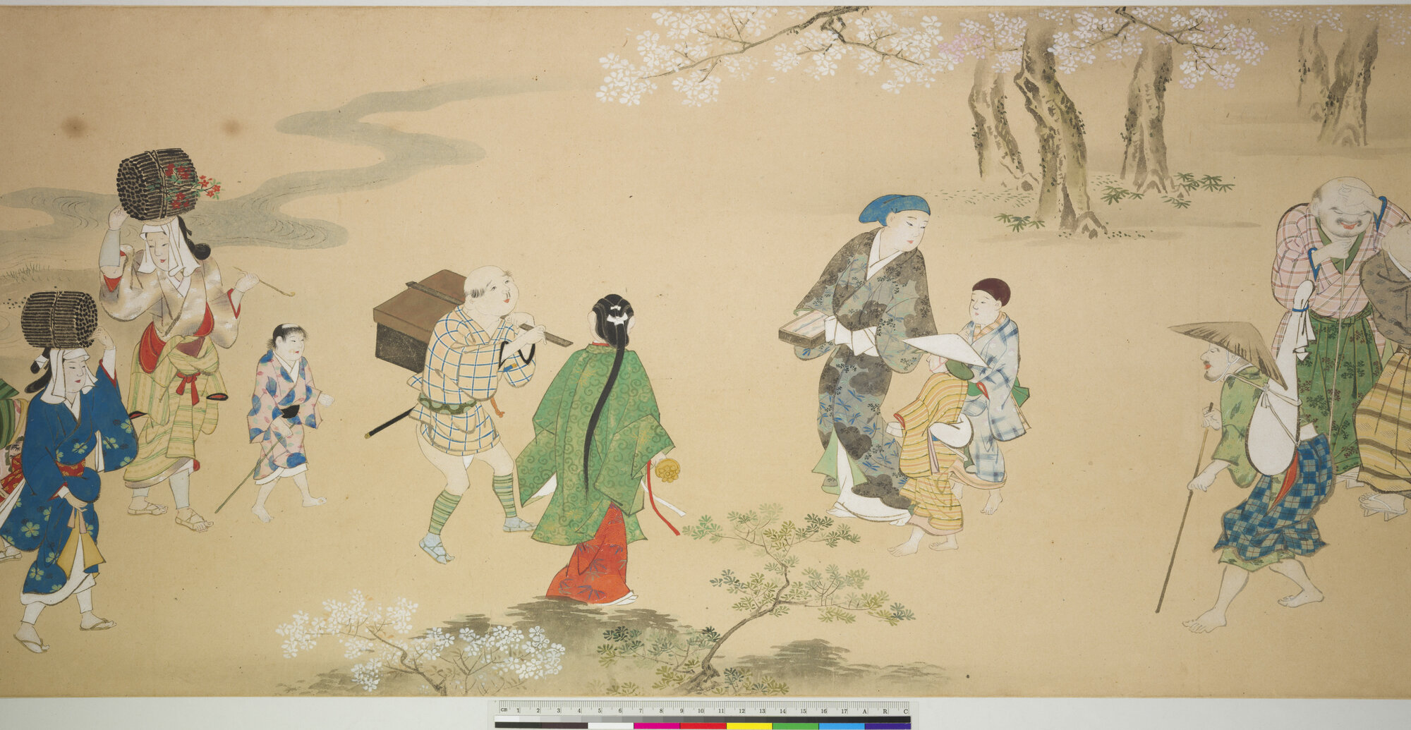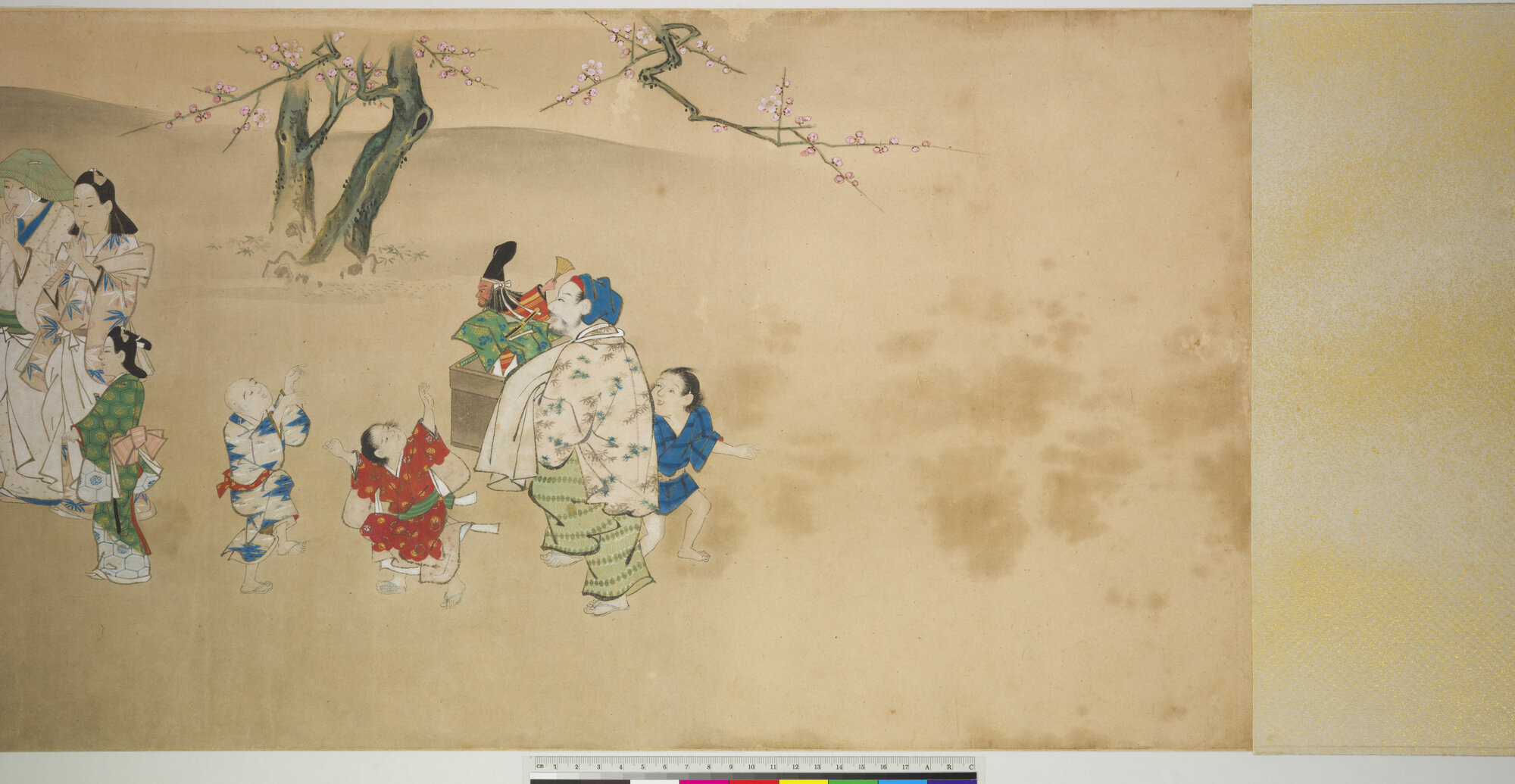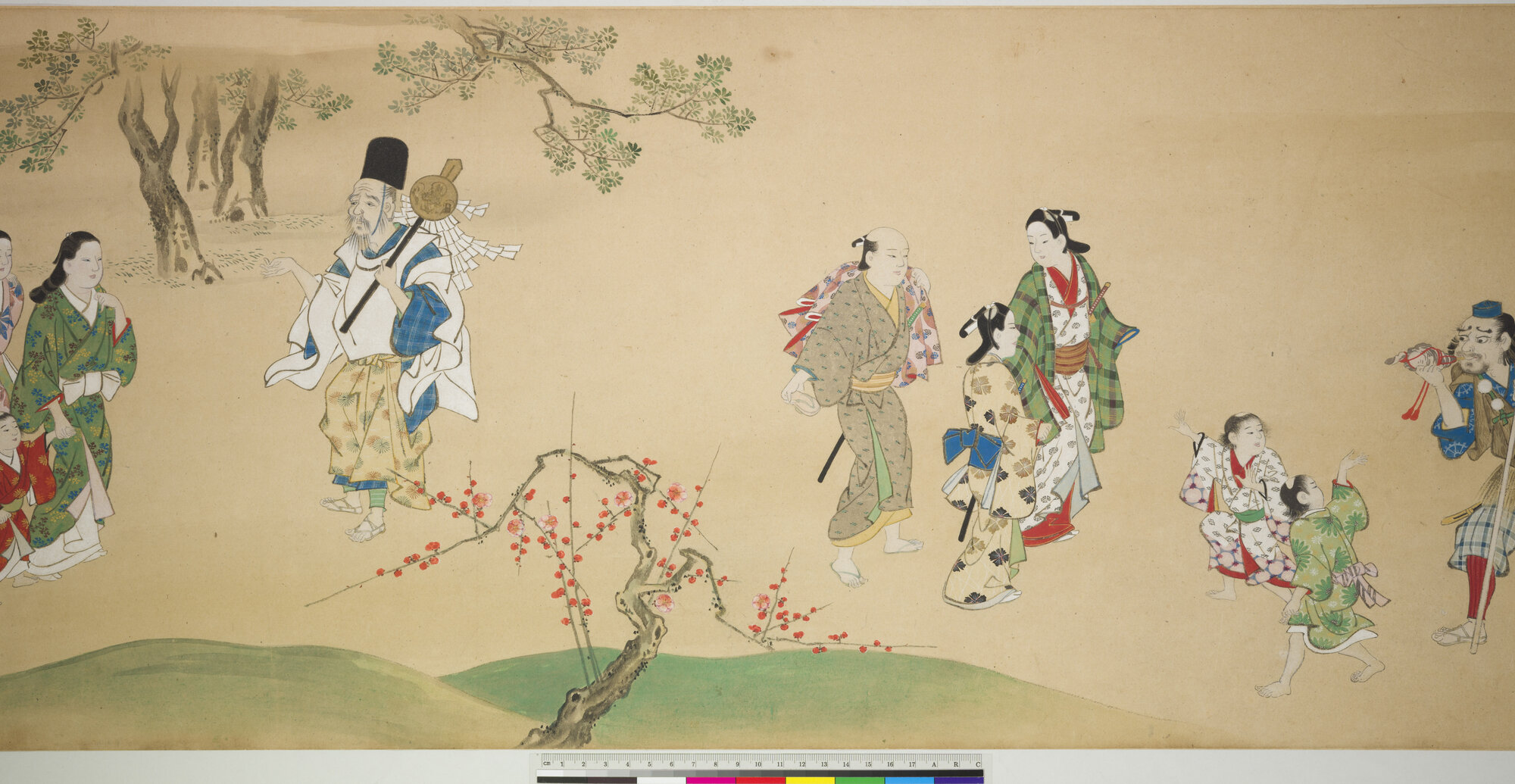 Rotolo dipinto con montatura nuova in seta: hyōshi in kinran a fondo verde-azzurro con minuto motivo geometrico a scacchiera e rondelle con foglie; mikaeshi in carta decorata con kin-sunago; jikushu in legno di ciliegio naturale tornito e decorato in lacca makie con fiori e petali di ciliegio. Formato da quattro scene, il rotolo si apre con un albero di susino in fiore, davanti al quale fa il suo spettacolo un burattinaio ambulante circondato da tre bambini. Lì accanto, tra un ciliegio fiorito e un pino, un manzai vestito di un suō grigio chiaro a disegni verdi e blu, con il copricapo haberi eoshi e un ventaglio pieghevole in mano, danza al suono del tamburello da spalla del saizō e del flauto shakuhachi di due komusō. Assistono al ballo tre ragazzini e una donna con tre bambine. La seconda scena è formata da tre gruppi: due anziani venditori di utensili da thé che portano rami di pino augurali; due fanciulli che si girano a guardare uno yamabushi che sta suonando una conchiglia ed è in compagnia di un attendente che porta sulla schiena un enorme cappello a forma di foglia di loto; un elegante attore effemminato accompagnato da un ragazzino e seguito da un servitore che trasporta un kimono. L'apertura del terzo episodio è segnata da un susino rosso. Un prete shintoista avanza con un bastone rituale munito di cartigli. Gli viene incontro una cortigiana che tiene per mano un bambino ed è seguita da un ragazzino effemminato e da una cameriera con un infante in spalla. Il gruppo desta la curiosità di un ambulante. A breve distanza, seguita da due cameriere che portano fagotti, una dama incede coprendosi il capo con una mantiglia e si gira all'indietro in direzione di un uomo con un'enorme maschera di leone cinese che sta per iniziare una danza al ritmo del kankaradaiko. Nei pressi stanno in ascolto due uomini e un bambino ciechi e un suonatore di liuto che si allontana a lunghi passi, con lo strumento in spalla avvolto in un telo bianco. La quarta scena inizia presso alcuni ciliegi in fiore. Una donna con i capelli ravvolti in una cuffia grigia incede insieme a un bambino e a una bambina, mentre in senso opposto procede una sacerdotessa shintoista accompagnata da un servo che porta un bauletto a stanga. Per ultime vengono tre Ōharame che trasportano fascine di legna da ardere. Chiude la composizione un ruscello che serpeggia tra rive erbose