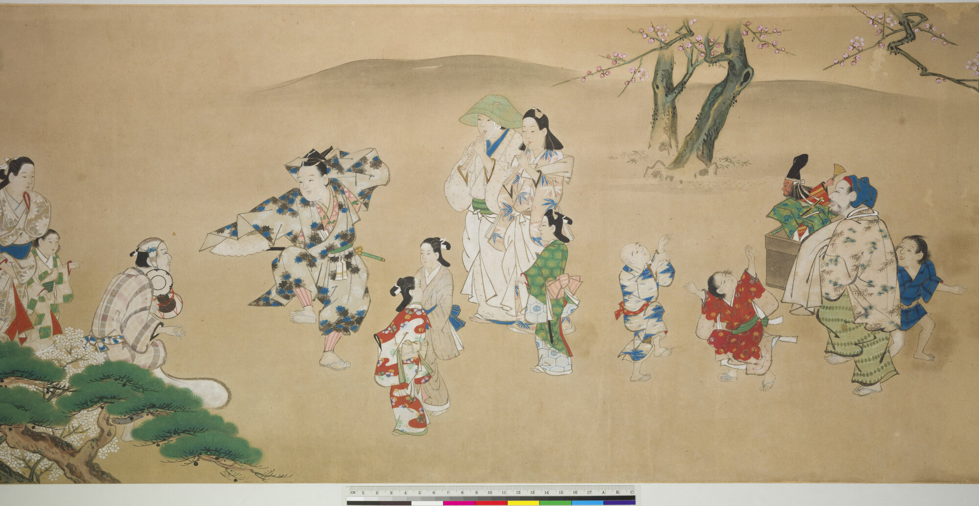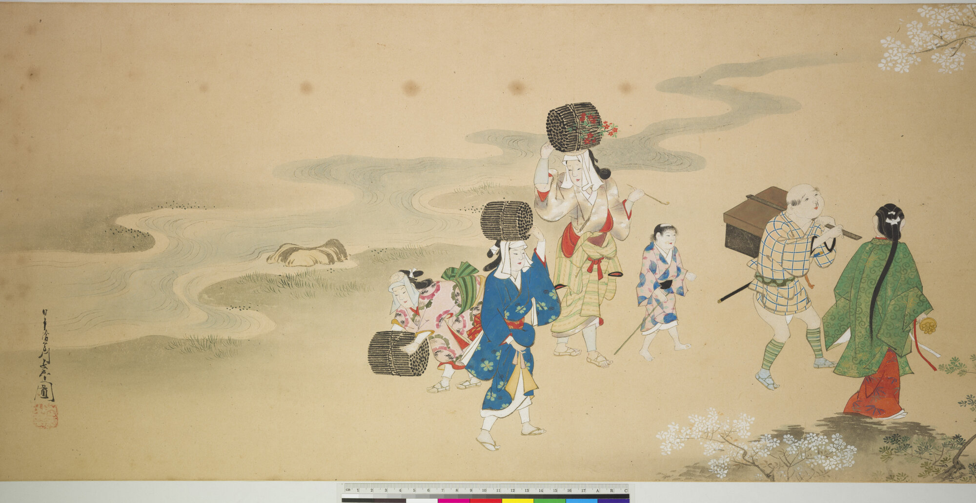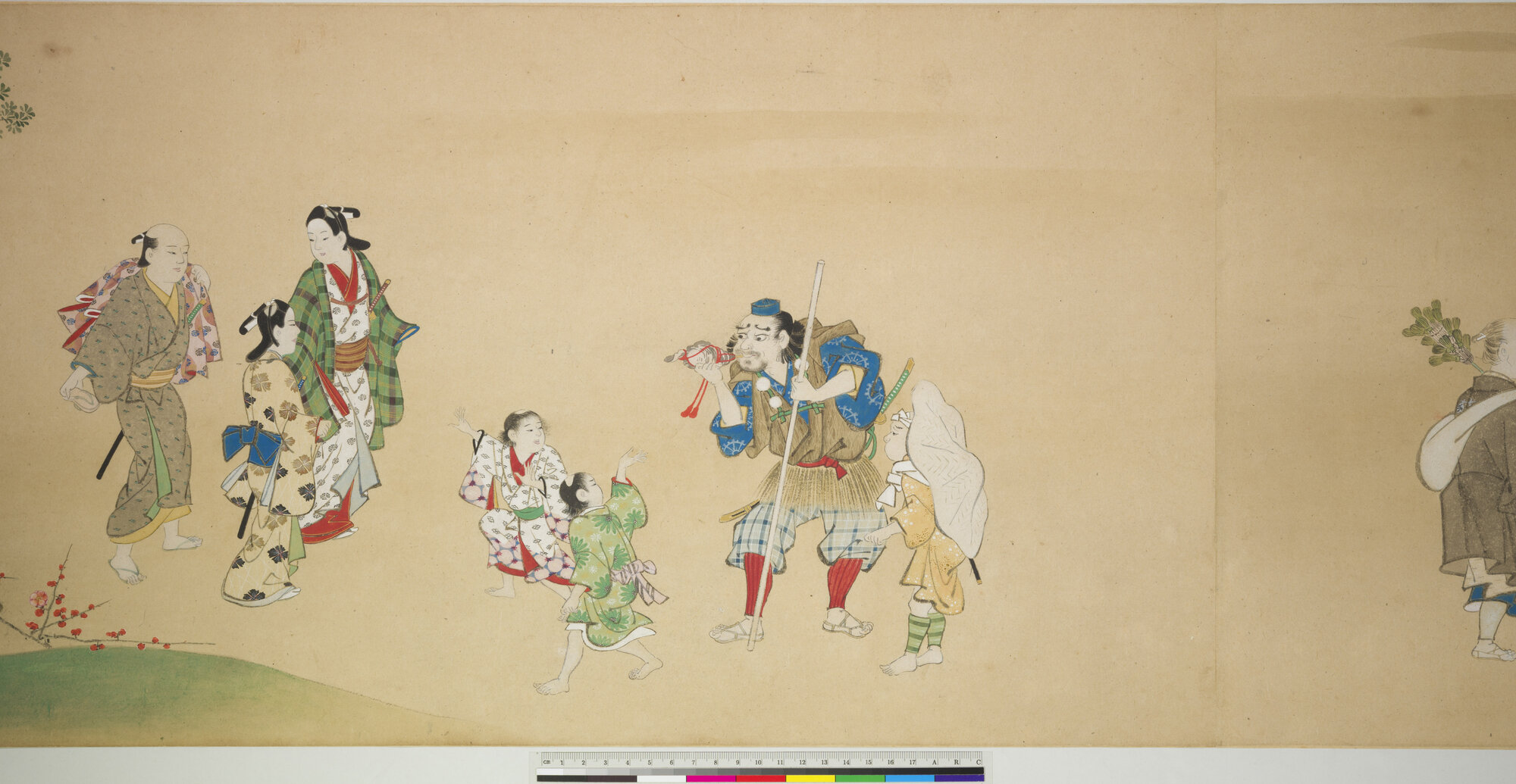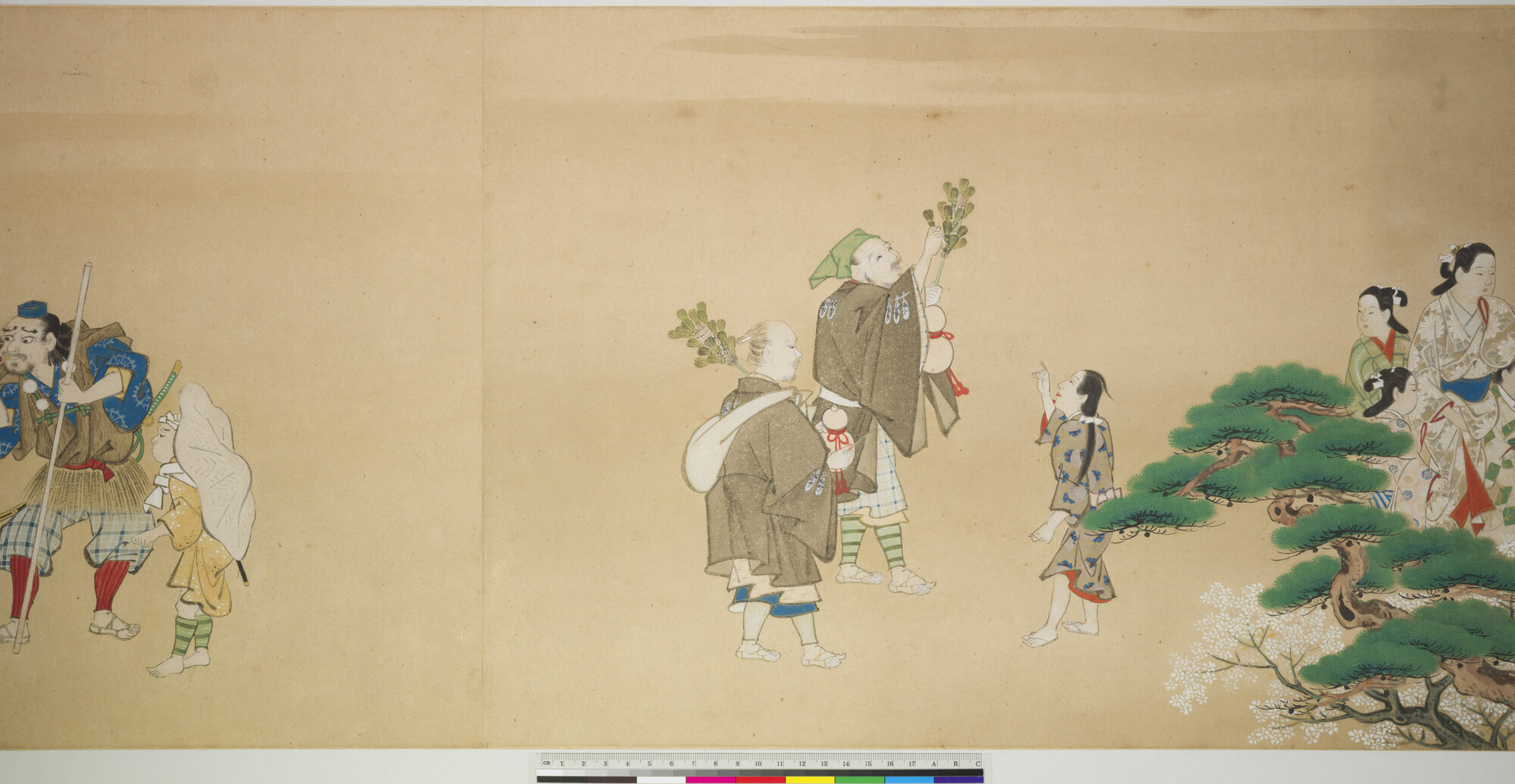 Rotolo dipinto con montatura nuova in seta: hyōshi in kinran a fondo verde-azzurro con minuto motivo geometrico a scacchiera e rondelle con foglie; mikaeshi in carta decorata con kin-sunago; jikushu in legno di ciliegio naturale tornito e decorato in lacca makie con fiori e petali di ciliegio. Formato da quattro scene, il rotolo si apre con un albero di susino in fiore, davanti al quale fa il suo spettacolo un burattinaio ambulante circondato da tre bambini. Lì accanto, tra un ciliegio fiorito e un pino, un manzai vestito di un suō grigio chiaro a disegni verdi e blu, con il copricapo haberi eoshi e un ventaglio pieghevole in mano, danza al suono del tamburello da spalla del saizō e del flauto shakuhachi di due komusō. Assistono al ballo tre ragazzini e una donna con tre bambine. La seconda scena è formata da tre gruppi: due anziani venditori di utensili da thé che portano rami di pino augurali; due fanciulli che si girano a guardare uno yamabushi che sta suonando una conchiglia ed è in compagnia di un attendente che porta sulla schiena un enorme cappello a forma di foglia di loto; un elegante attore effemminato accompagnato da un ragazzino e seguito da un servitore che trasporta un kimono. L'apertura del terzo episodio è segnata da un susino rosso. Un prete shintoista avanza con un bastone rituale munito di cartigli. Gli viene incontro una cortigiana che tiene per mano un bambino ed è seguita da un ragazzino effemminato e da una cameriera con un infante in spalla. Il gruppo desta la curiosità di un ambulante. A breve distanza, seguita da due cameriere che portano fagotti, una dama incede coprendosi il capo con una mantiglia e si gira all'indietro in direzione di un uomo con un'enorme maschera di leone cinese che sta per iniziare una danza al ritmo del kankaradaiko. Nei pressi stanno in ascolto due uomini e un bambino ciechi e un suonatore di liuto che si allontana a lunghi passi, con lo strumento in spalla avvolto in un telo bianco. La quarta scena inizia presso alcuni ciliegi in fiore. Una donna con i capelli ravvolti in una cuffia grigia incede insieme a un bambino e a una bambina, mentre in senso opposto procede una sacerdotessa shintoista accompagnata da un servo che porta un bauletto a stanga. Per ultime vengono tre Ōharame che trasportano fascine di legna da ardere. Chiude la composizione un ruscello che serpeggia tra rive erbose