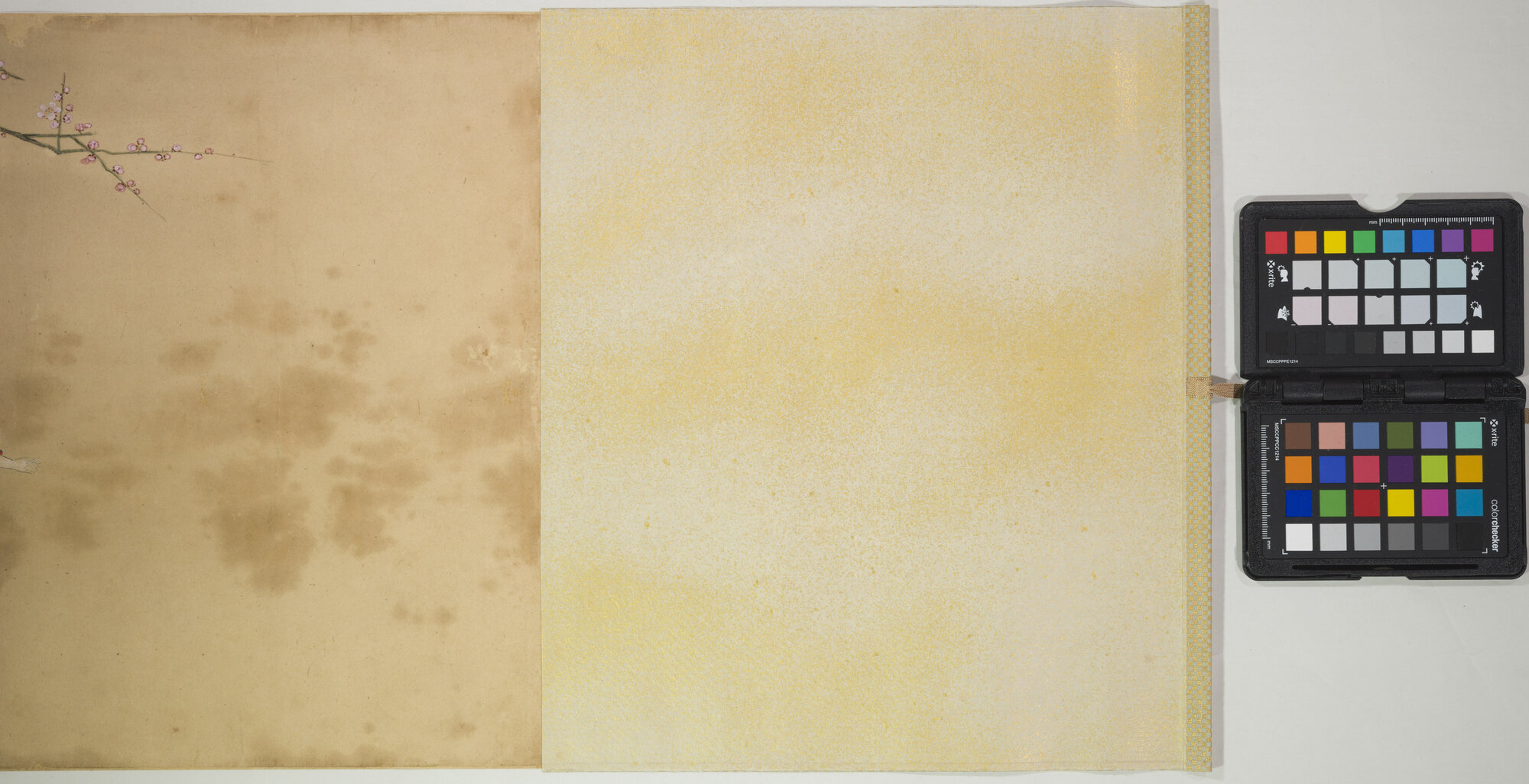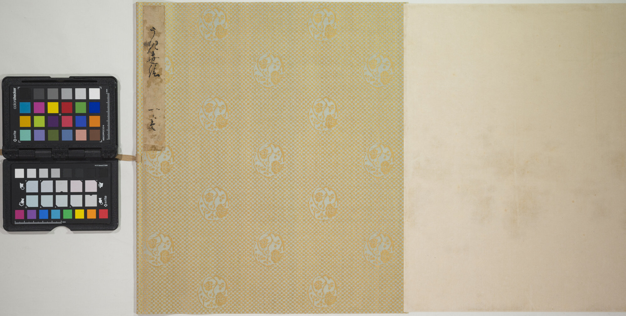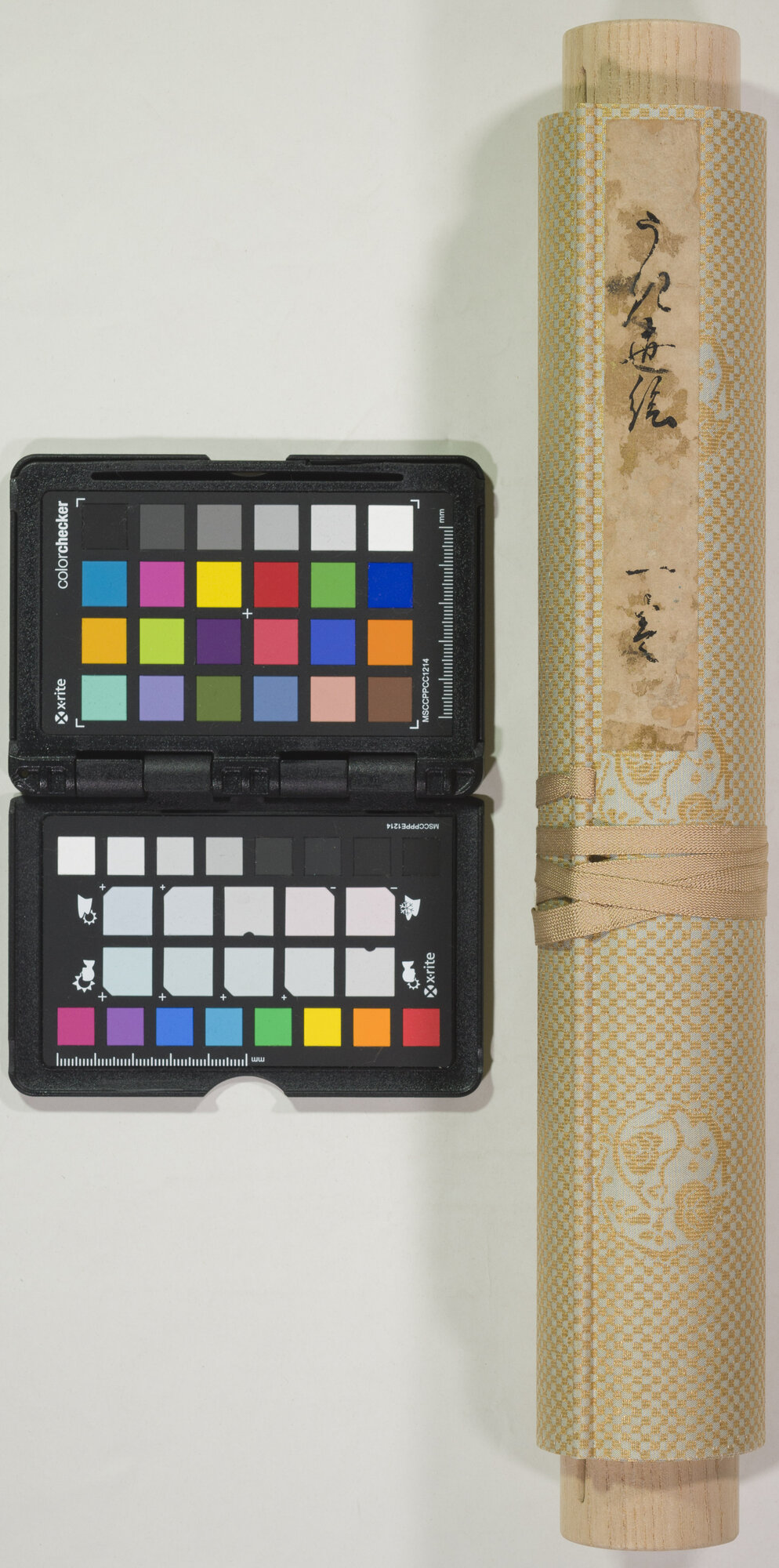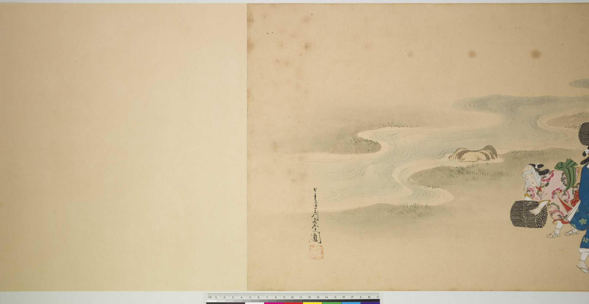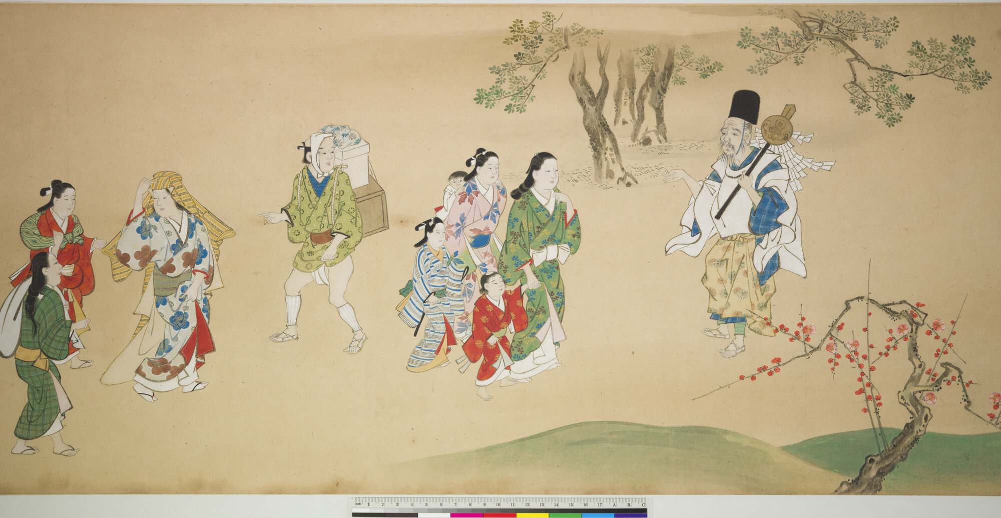 Rotolo dipinto con montatura nuova in seta: hyōshi in kinran a fondo verde-azzurro con minuto motivo geometrico a scacchiera e rondelle con foglie; mikaeshi in carta decorata con kin-sunago; jikushu in legno di ciliegio naturale tornito e decorato in lacca makie con fiori e petali di ciliegio. Formato da quattro scene, il rotolo si apre con un albero di susino in fiore, davanti al quale fa il suo spettacolo un burattinaio ambulante circondato da tre bambini. Lì accanto, tra un ciliegio fiorito e un pino, un manzai vestito di un suō grigio chiaro a disegni verdi e blu, con il copricapo haberi eoshi e un ventaglio pieghevole in mano, danza al suono del tamburello da spalla del saizō e del flauto shakuhachi di due komusō. Assistono al ballo tre ragazzini e una donna con tre bambine. La seconda scena è formata da tre gruppi: due anziani venditori di utensili da thé che portano rami di pino augurali; due fanciulli che si girano a guardare uno yamabushi che sta suonando una conchiglia ed è in compagnia di un attendente che porta sulla schiena un enorme cappello a forma di foglia di loto; un elegante attore effemminato accompagnato da un ragazzino e seguito da un servitore che trasporta un kimono. L'apertura del terzo episodio è segnata da un susino rosso. Un prete shintoista avanza con un bastone rituale munito di cartigli. Gli viene incontro una cortigiana che tiene per mano un bambino ed è seguita da un ragazzino effemminato e da una cameriera con un infante in spalla. Il gruppo desta la curiosità di un ambulante. A breve distanza, seguita da due cameriere che portano fagotti, una dama incede coprendosi il capo con una mantiglia e si gira all'indietro in direzione di un uomo con un'enorme maschera di leone cinese che sta per iniziare una danza al ritmo del kankaradaiko. Nei pressi stanno in ascolto due uomini e un bambino ciechi e un suonatore di liuto che si allontana a lunghi passi, con lo strumento in spalla avvolto in un telo bianco. La quarta scena inizia presso alcuni ciliegi in fiore. Una donna con i capelli ravvolti in una cuffia grigia incede insieme a un bambino e a una bambina, mentre in senso opposto procede una sacerdotessa shintoista accompagnata da un servo che porta un bauletto a stanga. Per ultime vengono tre Ōharame che trasportano fascine di legna da ardere. Chiude la composizione un ruscello che serpeggia tra rive erbose
