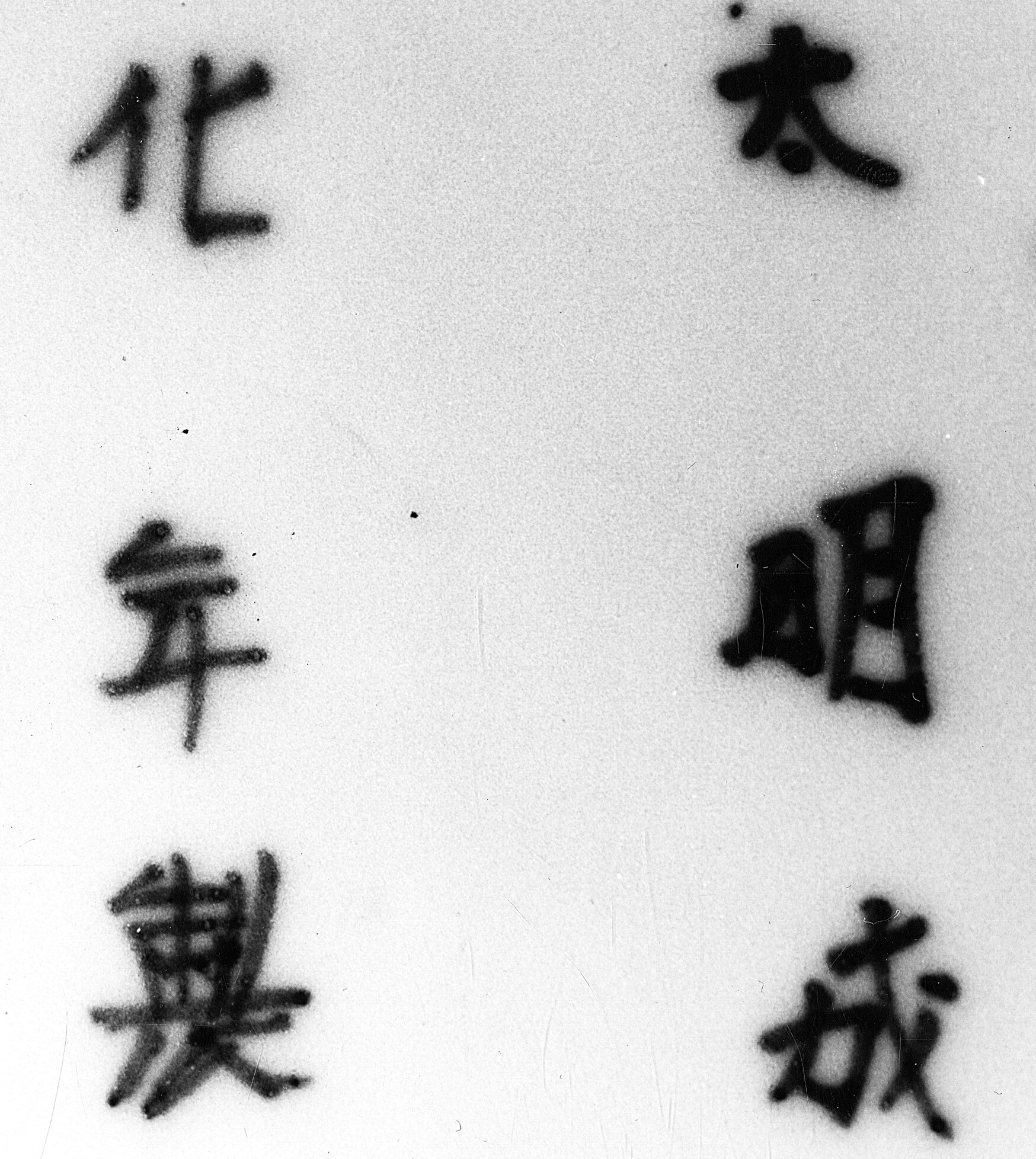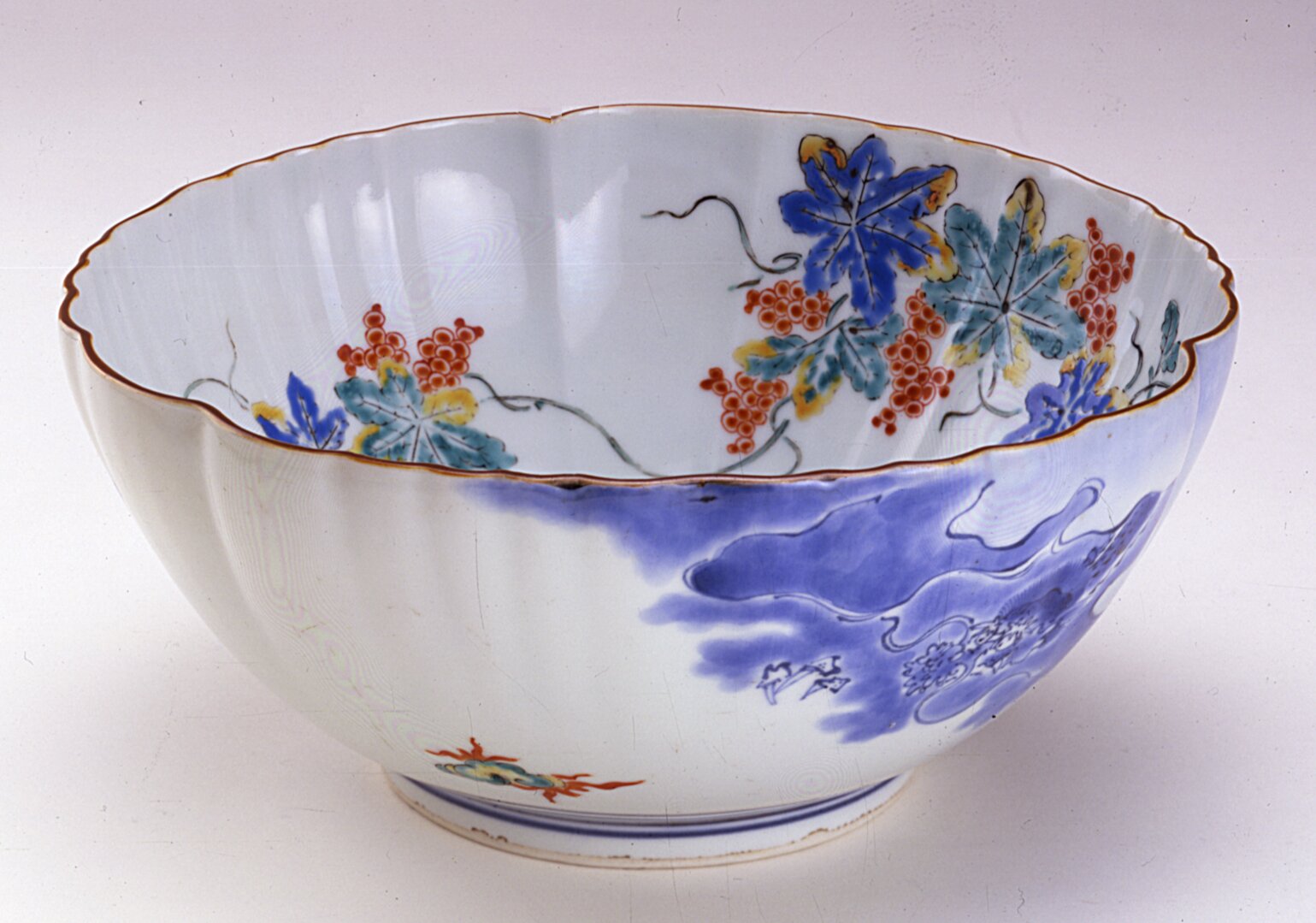 Coppa (donburi) di forma emisferica con pareti baccellate e piede ad anello. La porcellana bianca e sottile è interamente rivestita da una coperta livemente azzurrina. Sulla parete esterna emerge dalle nuvole un lungo drago con zampe a tre artigli che riconcorre la perla tama. Il piede è sottolineato da due filetti in blu mentre l'orlo da uno smalto marrone. All'interno, sul fondo, compare un fiore di pesco momo stilizzato, dal quale si diramano radialmente cinque racemi. Sulla parete curva si espande un tralcio di vite con grappoli e viticci