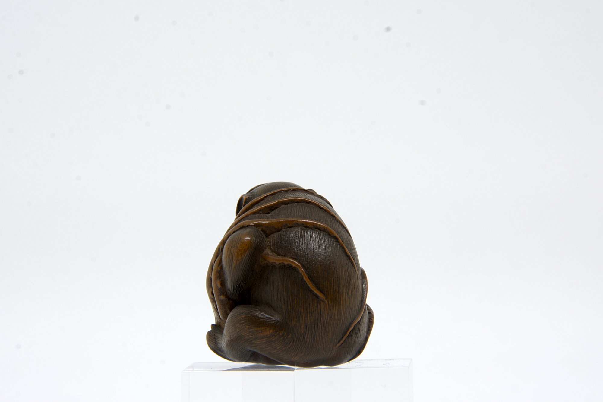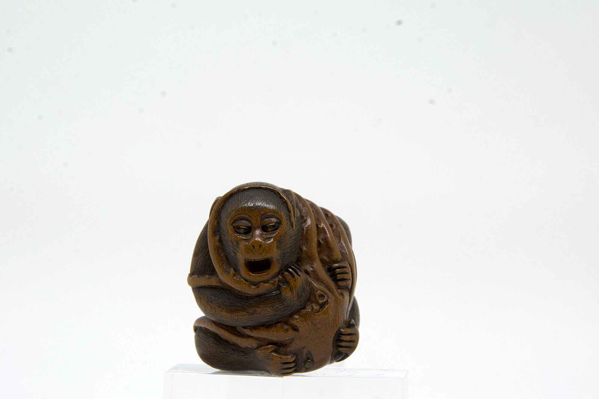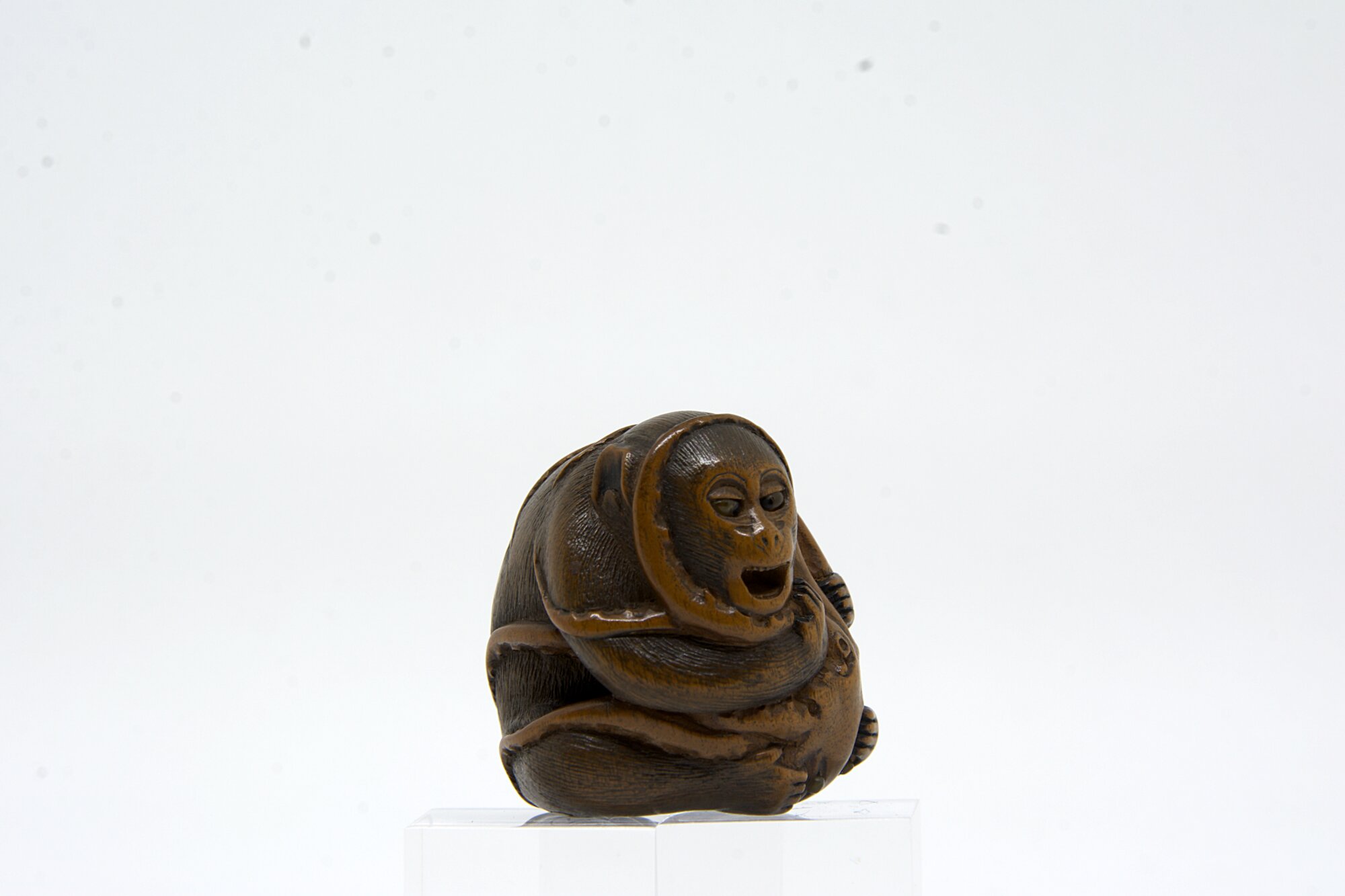 Netsuke raffigurante una scimmia che tenta invano di liberarsi da un polpo, spingendo l'animale acquatico con tutti e quattro gli arti. L'animale ha la bocca aperta in un lamento. Gli occhi sono costituiti da inserti realizzati in corno. Sono assenti i fori dell'himōtoshi