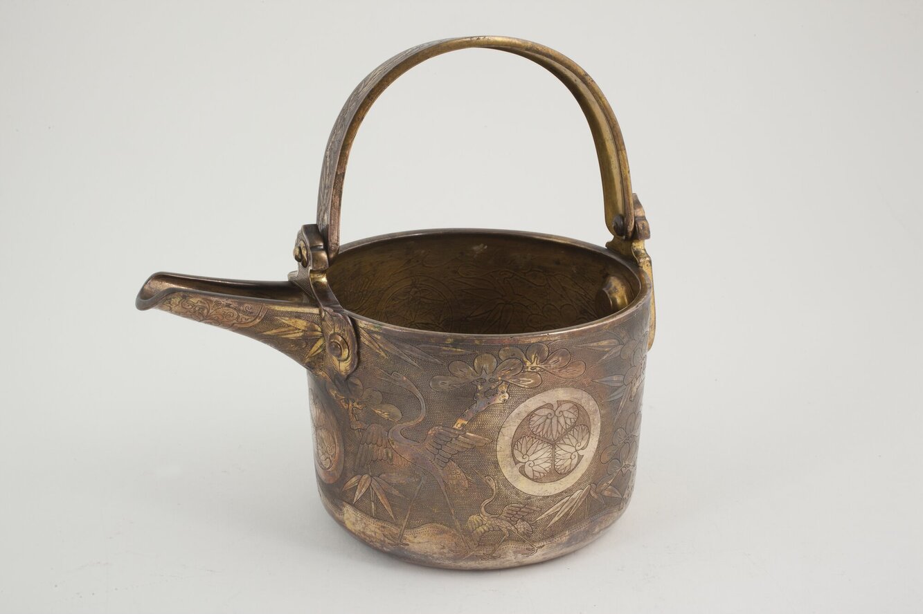 Vasi da uso cerimoniale con il fondo minutamente inciso a cerchietti. Sulla superfice sono raffigurate vedute di pini e bambù con gru. Lo stemma circolare della famiglia Tokugawa consiste in un cerchio con tre foglie di malva all'interno