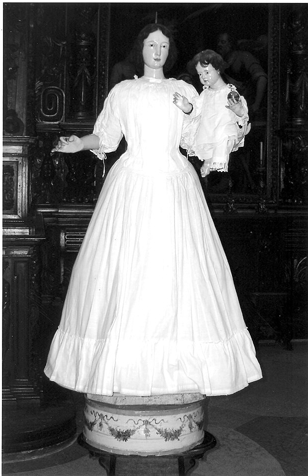 Statua lignea raffigurante la Madonna vestita con una sotto veste bianca e con in braccio Gesù