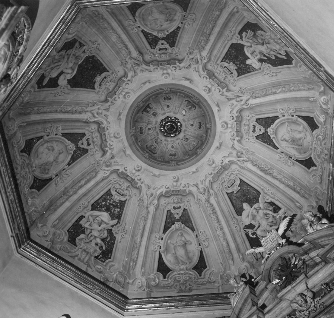 Angeli e putti alternati a figure allegoriche, dipinti a fresco a monocromo bianco su fondo oro entro ornamenti tipicamente rococò