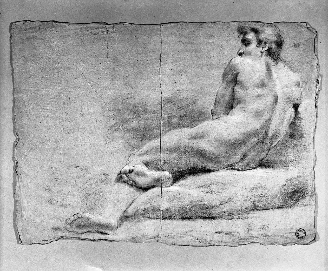 Studio accademico a carboncino, sfumino, pastello nero e biacca su carta grezza rappresentante un nudo virile di profilo, sedente, con la gamba sinistra a cavalcioni sul piede destro