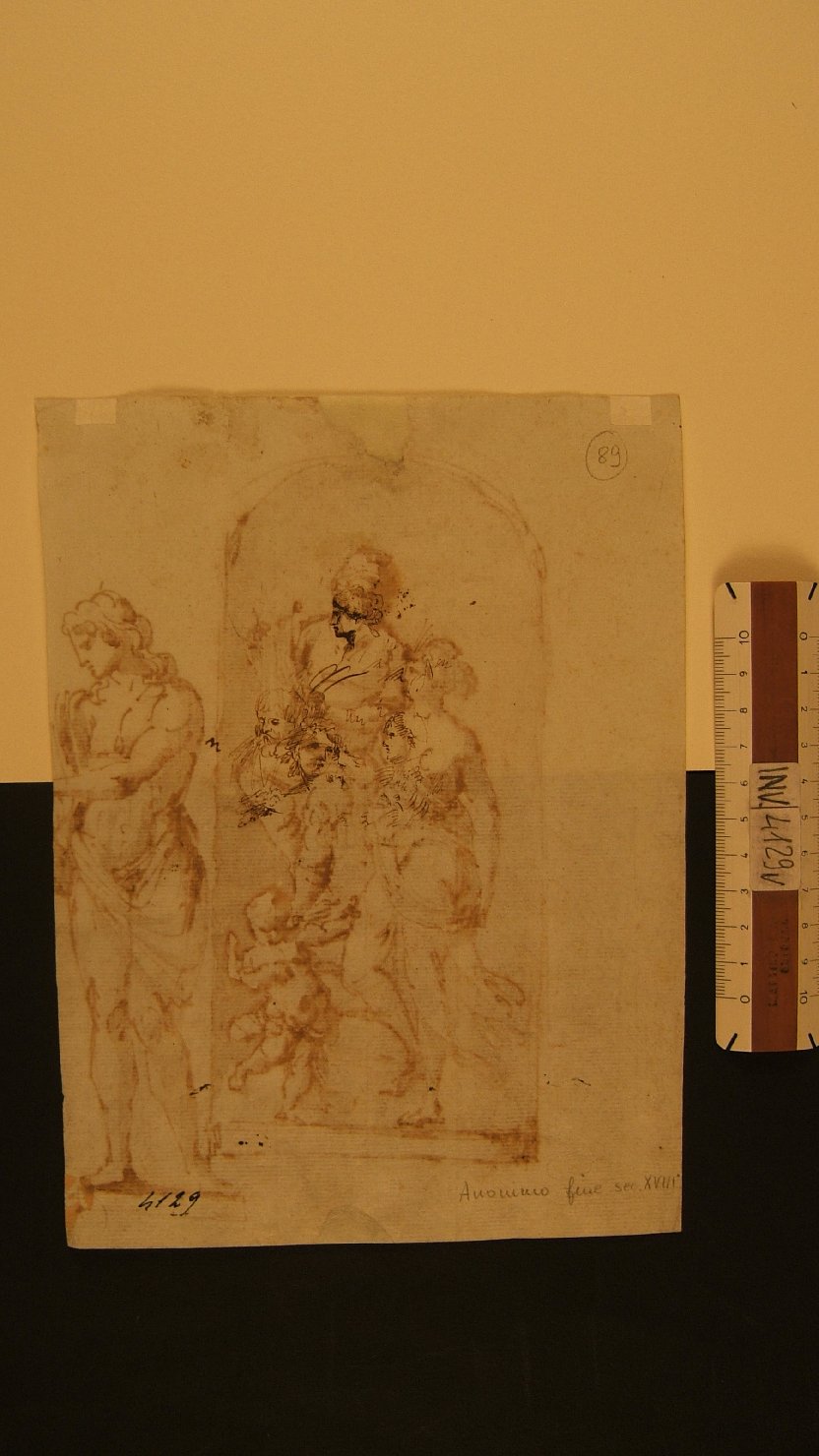 Disegno a penna marrone, bistro, matita nera e rossa su carta verdognola rappresentante a sinistra, in una nicchia, una figura femminile con Apollo che suona la lira. Ai piedi di questi, un putto. Al di fuori della nicchia una figura femminile. Sul verso, schizzo di quattro teste a penna