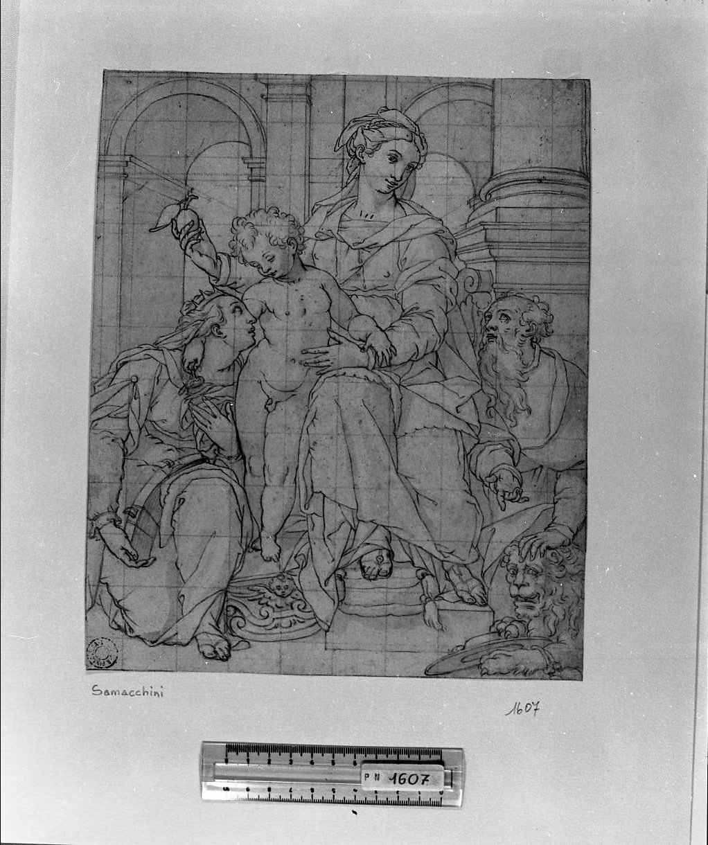Disegno a matita rossa e nera e penna su carta bianca quadrettata a matita nera rappresentante al centro la Madonna con il Bambino, che tiene con la mano destra un frutto. Ai lati Santa Caterina e San Girolamo