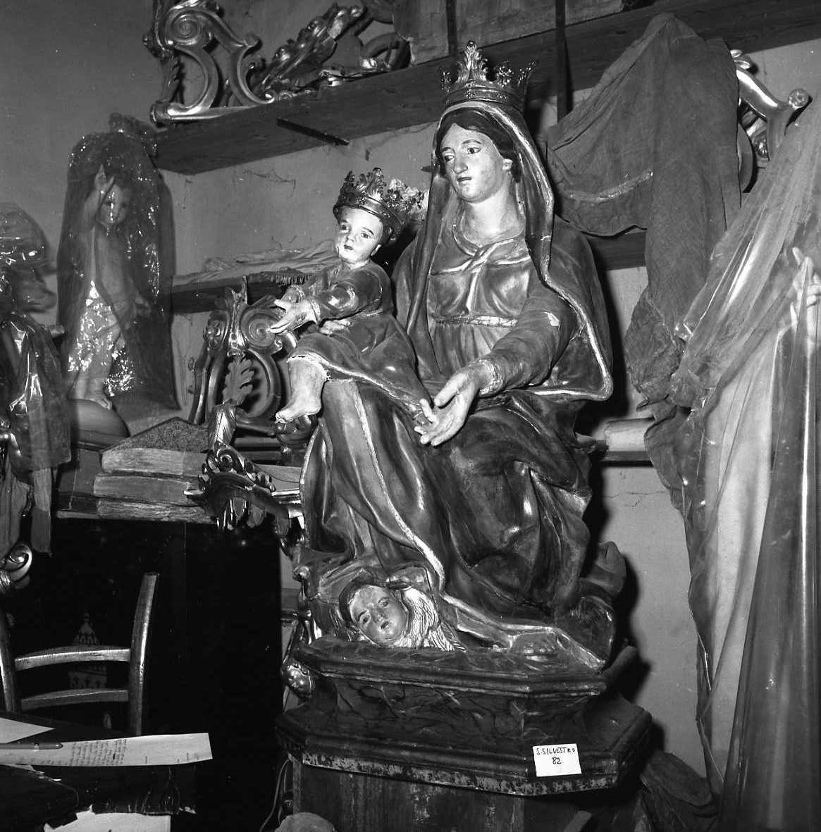 Base quadrata ad angoli tagliati, dipinta a finto marmo. La Madonna seduta, in veste rossa e manto blu bordato d'oro, tiene il Bambino seduto sul ginocchio destro. Il piede sinistro è a terra, l'altro poggia su di una testina di cherubino; il corpo è leggermente ruotato verso destra come quello del Bambino. Sulle teste, corone in lamina di rame argentata, sbalzata e cesellata con motivi di foglie d'acanto