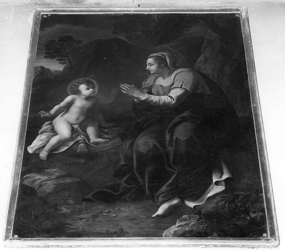 La Vergine è seduta a destra, in veste rossa e manto blu, a mani giunte, in atto di adorare il figlio, ignudo, seduto su un panno bianco che copre un cuscino con nappa rossa. Ambientazione di paesaggio