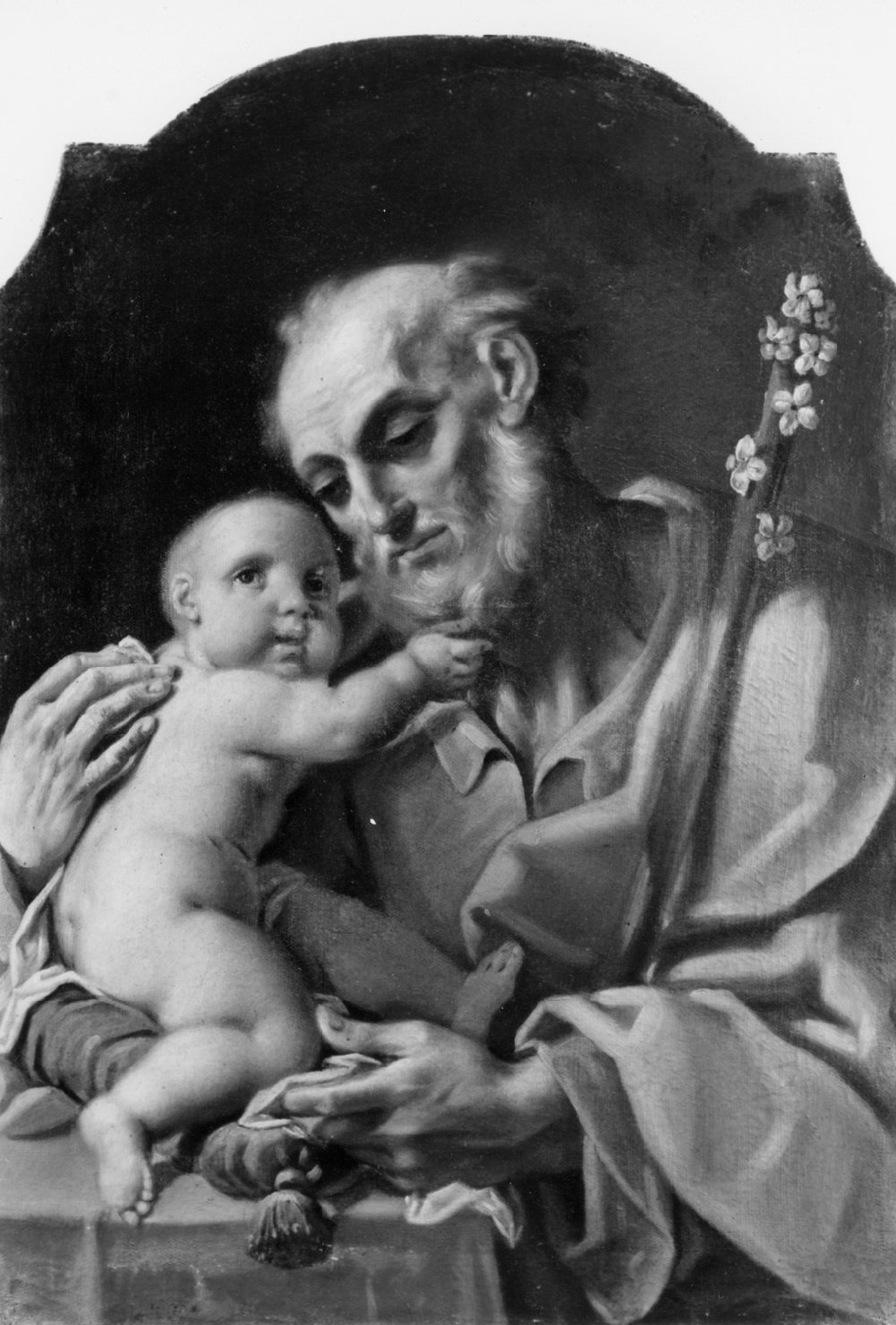 Mezza figura del Santo , in veste celeste e manto arancione, con bastone fiorito. Ha barba bianca, come i capelli radi e il volto chinato verso il bambino che cinge con le braccia. Il piccolo è ignudo , seduto su un cuscino azzurro con fiocco , appoggiato su una tavola con drappo rosso; volge il visetto paffuto verso l'osservatore e gioca con la barba del Santo. Entro cornice settecentesca lignea intagliata e dorata , con fregi fitomorfi e volute applicati; al sommo cimasa spezzata