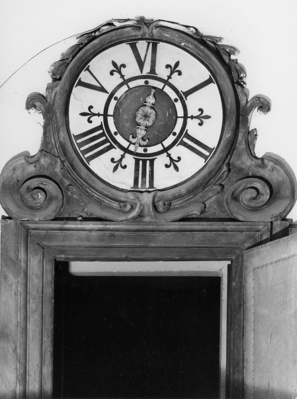 Rotondo, dipinto in bianco con numeri romani in nero, inframmezzati da un giglio stilizzato. Entro cornice rotonda dipinta color terracotta con due grandi volute alla base e due festoni in alto