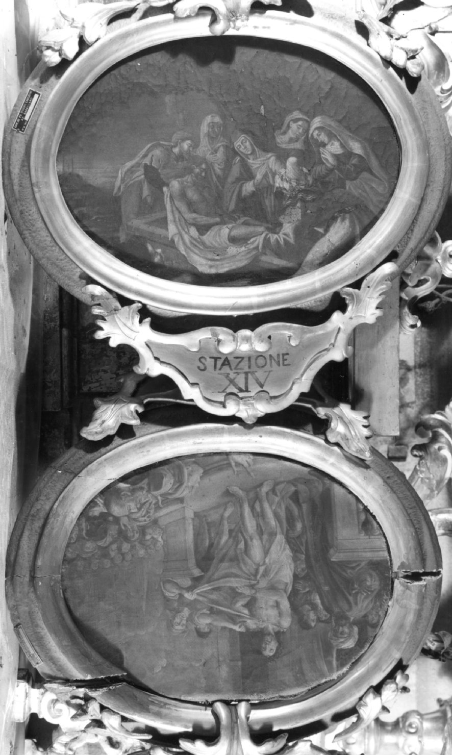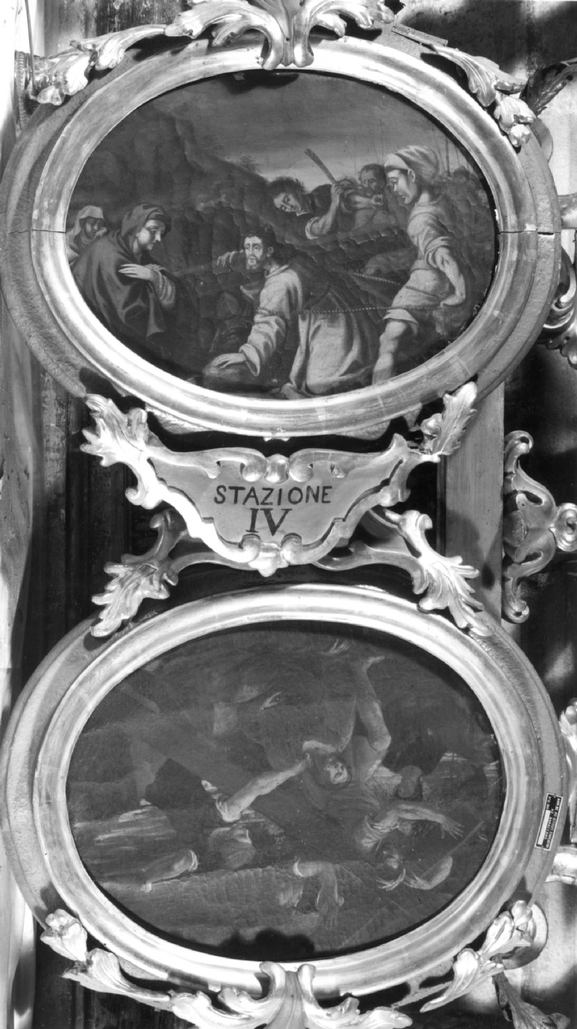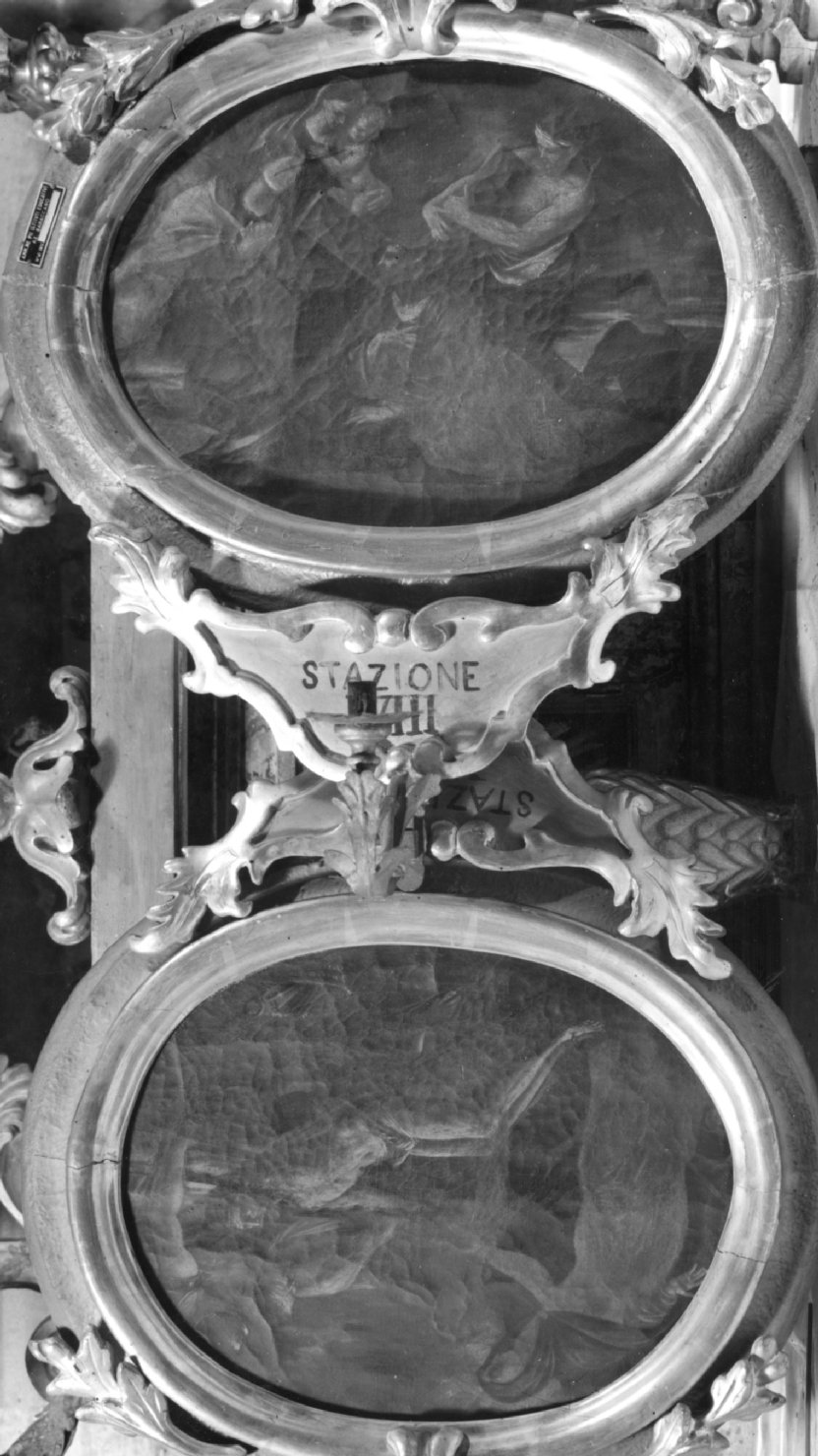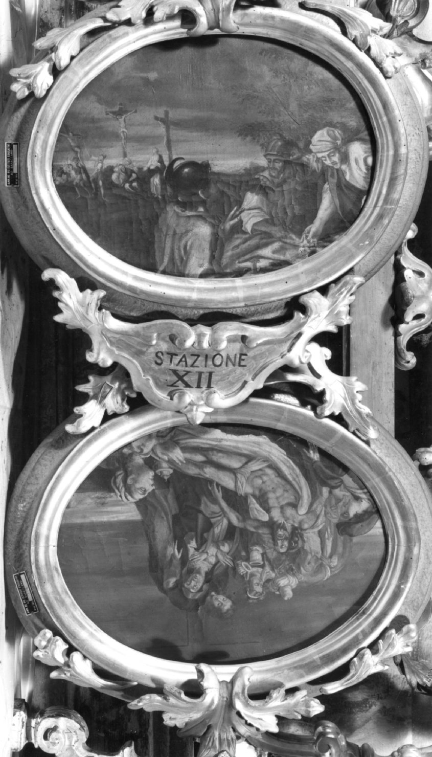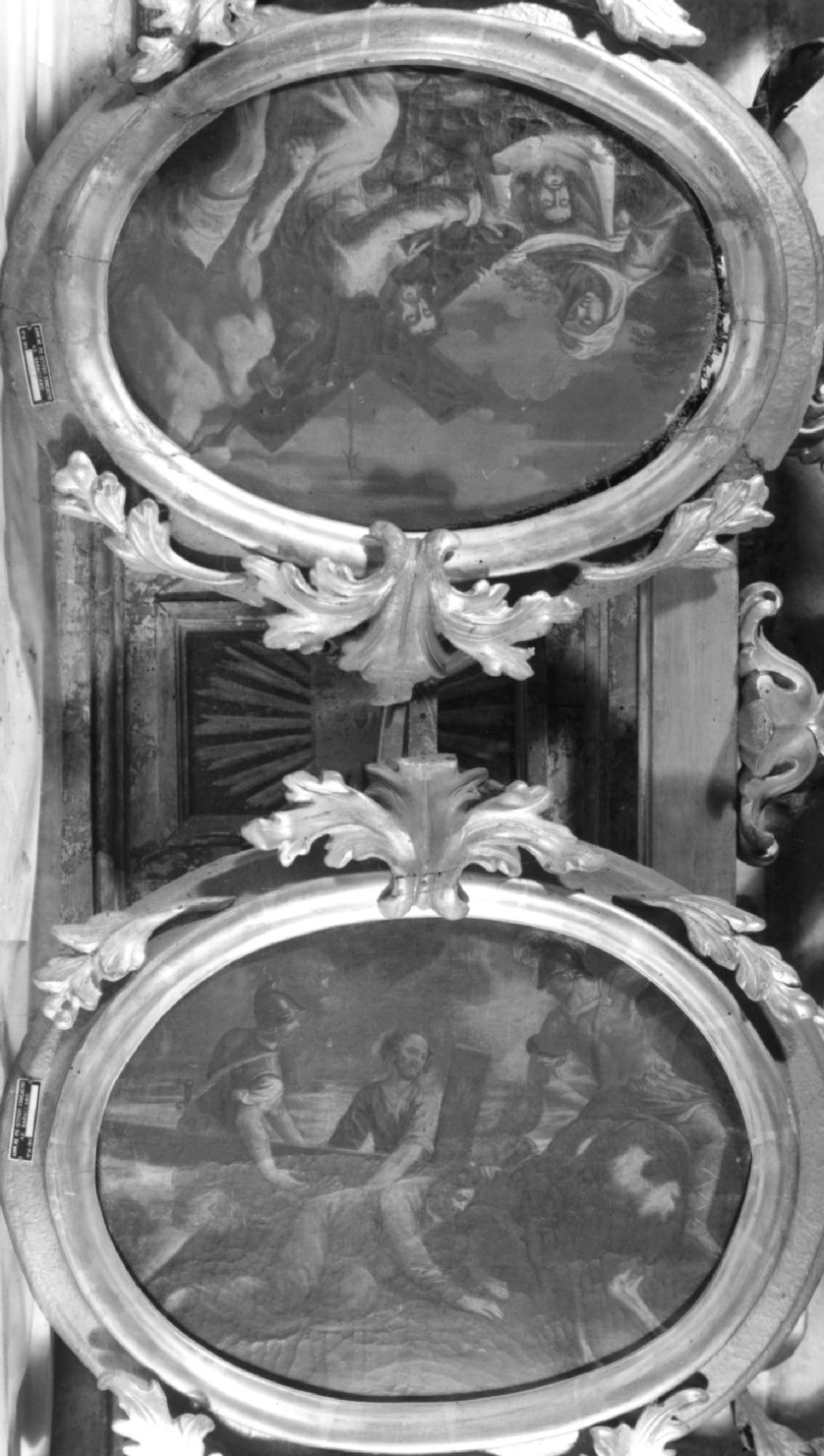 le scene sono poco polate, le figure sono ben disegnate e colorite con toni caldi. Iconografia consueta. Entro cornici lignee ovali dorate, con intagli di foglie (3) al sommo e cartiglio in basso