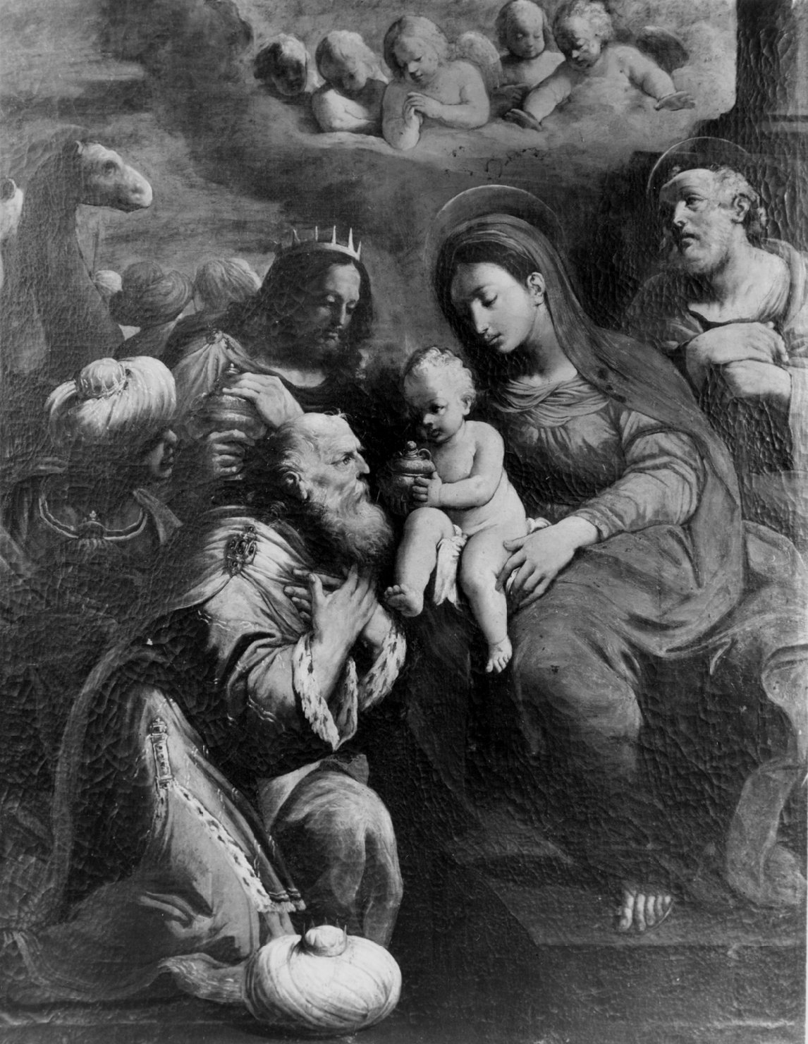 Alla destra siede la Vergine in veste rossa e manto azzurro, viso piegato verso il Bimbo ignudo che tiene seduto sulle ginocchia; questi è in atto di accettare il dono di uno dei Magi , con barba bianca, inginocchiato a destra, con mani incrociate sul petto e ricche vesti. nel fondo a sinistra due dromedari e teste di servi. A destra dietro la Vergine , appoggiato al basamento di una colonna è san Giuseppe, con bastone, veste viola e manto marrone