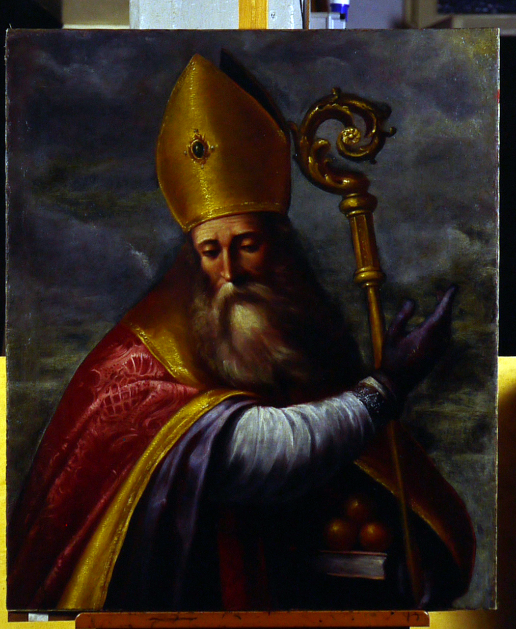 - NOTIZIE STORICO CRITICHE Nella scheda storica, redatta da Buscaroli nel 1932, il dipinto è collocato cronologicamente nella prima metà del XVIII secolo mentre l'analisi stilistica più recente (Masini 1995) ne anticipa la datazione di un secolo, in funzione delle valutazioni stilistiche: in particolare si veda la saldezza della figura e la stesura pittorica naturalistica che contribuisce a definire i volumi. Rubbini aggiunge che i riferimenti stilistici rimandano chiaramente alla seconda metà del Cinquecento. Per quanto riguarda le vicende del dipinto, esso compare nell'inventario dell'Opera Pia a partire dal 1892. Quale erede Scarani l'Opera Pia dal 1856 entrò in possesso del beneficio semplice dedicato a San Nicola nella chiesa di San Nicola degli Albari e della chesa di San Tommaso al mercato. Questa circostanza potrebbe spiegare la presenza dei dipinti dedicati a San Nicola nella collezione dell'Opera Pia