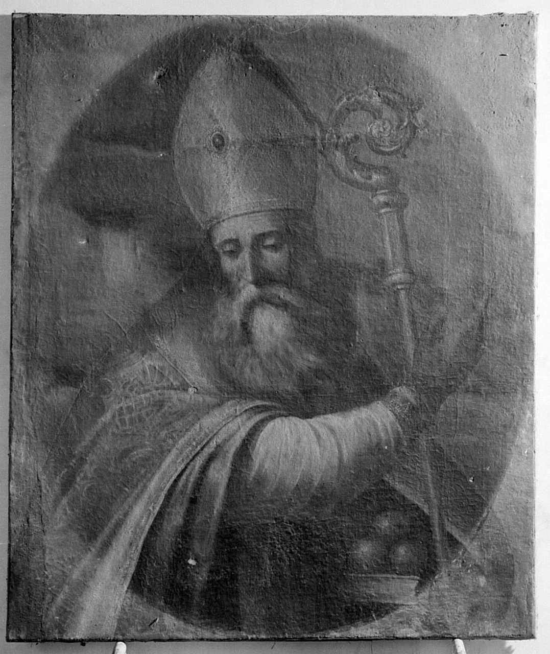 Il Santo è ritratto a mezzo busto, con la tiara impreziosita da una gemma, il bastone pastorale e nella sinistra anche il libro con le tre sfere sopra. Con la mano destra indica il cielo, ma lo sguardo è rivolto verso il basso