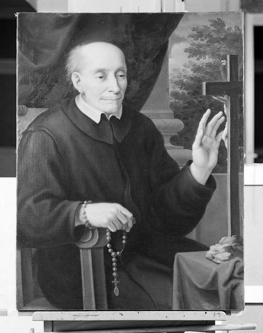 Ritratto d'uomo di Chiesa, vestito di nero, con una corona del Rosario nella mano destra e attorno al polso, la sinistra alzata