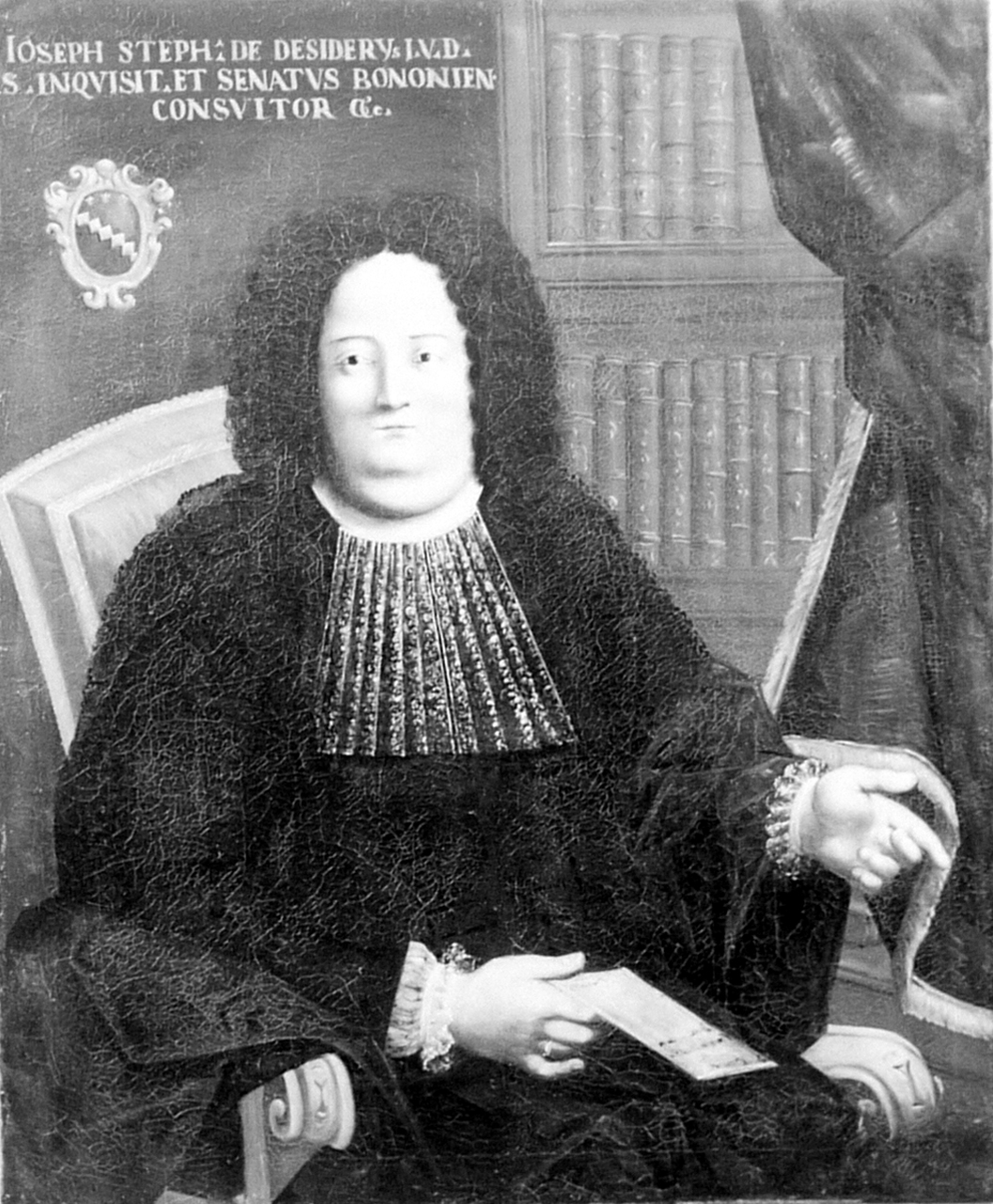 - ISCRIZIONI in alto a sinistra - IOSEPH STEPG: DE DESIDERYS I.U.D. S. INQUISIT. ET SENATUS BONONIEN. CONSULTOR - lettere capitali - a pennello -