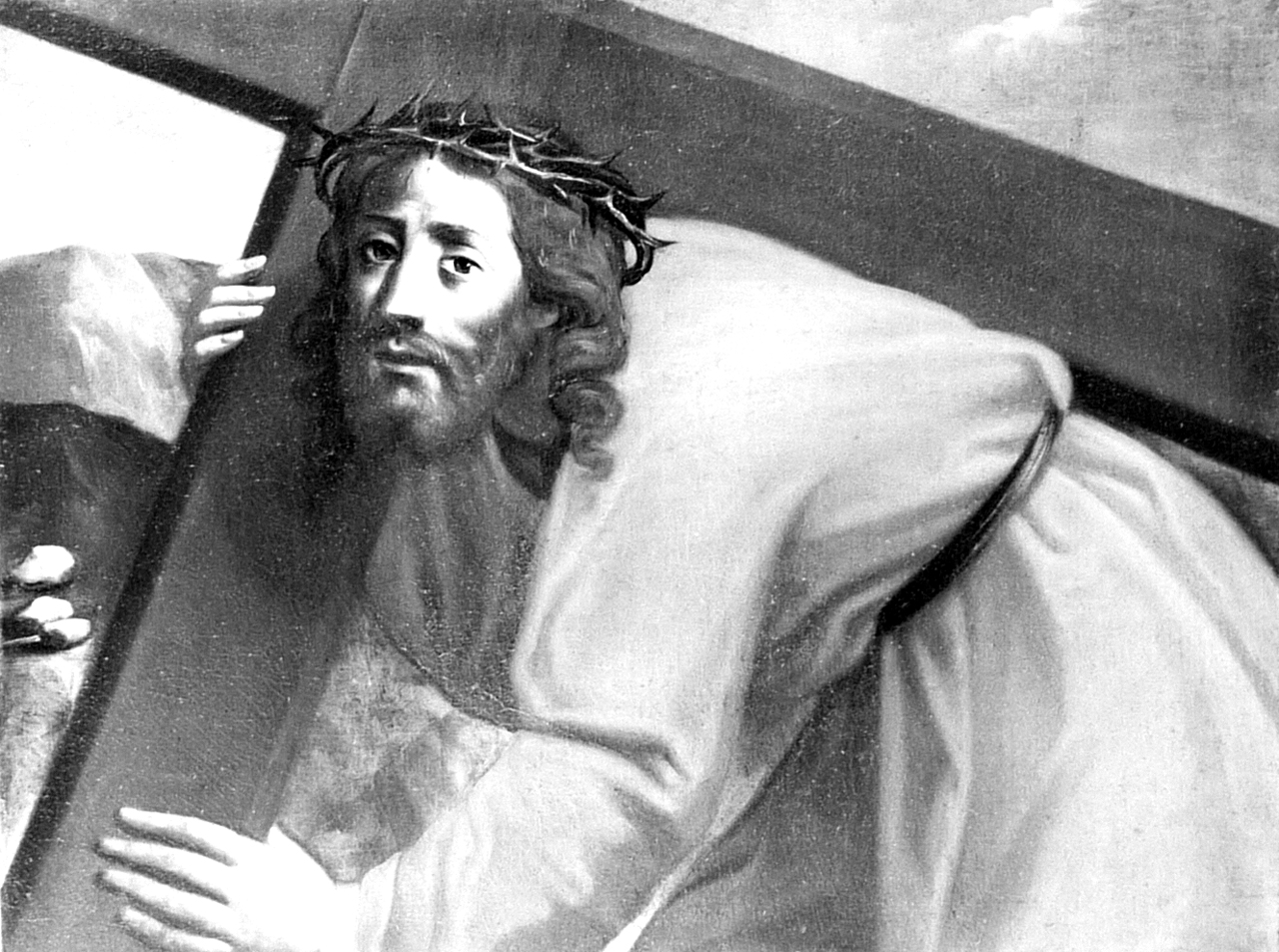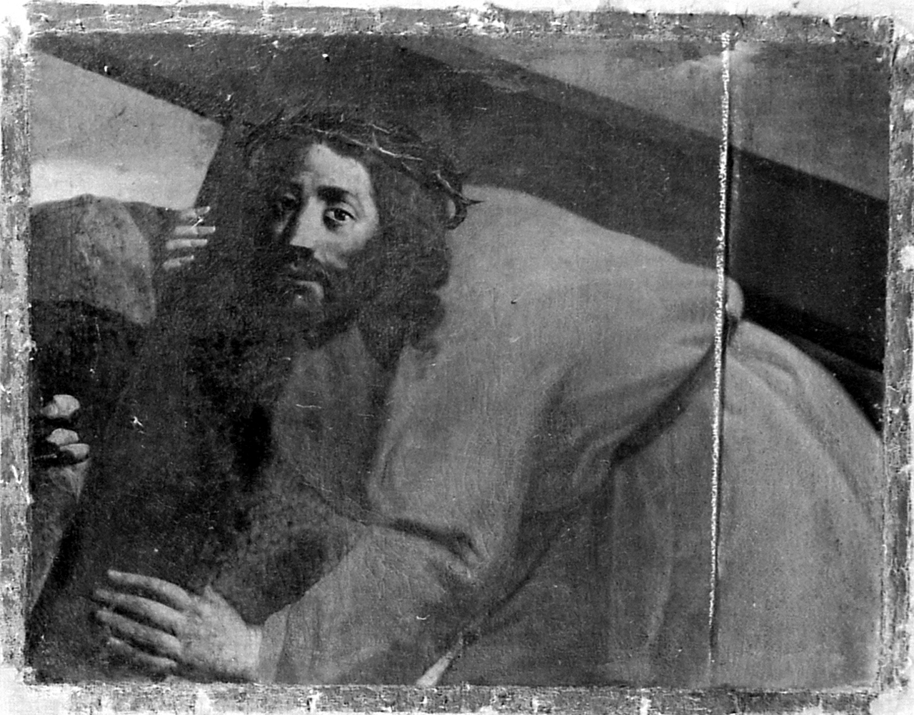 Cristo vestito di rosso e piegato sotto la croce di cui si vede solo una parte. Sullo sfondo un paesaggio brullo