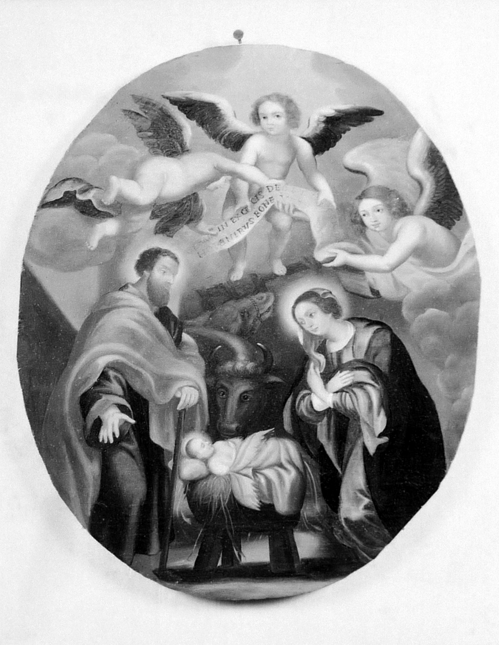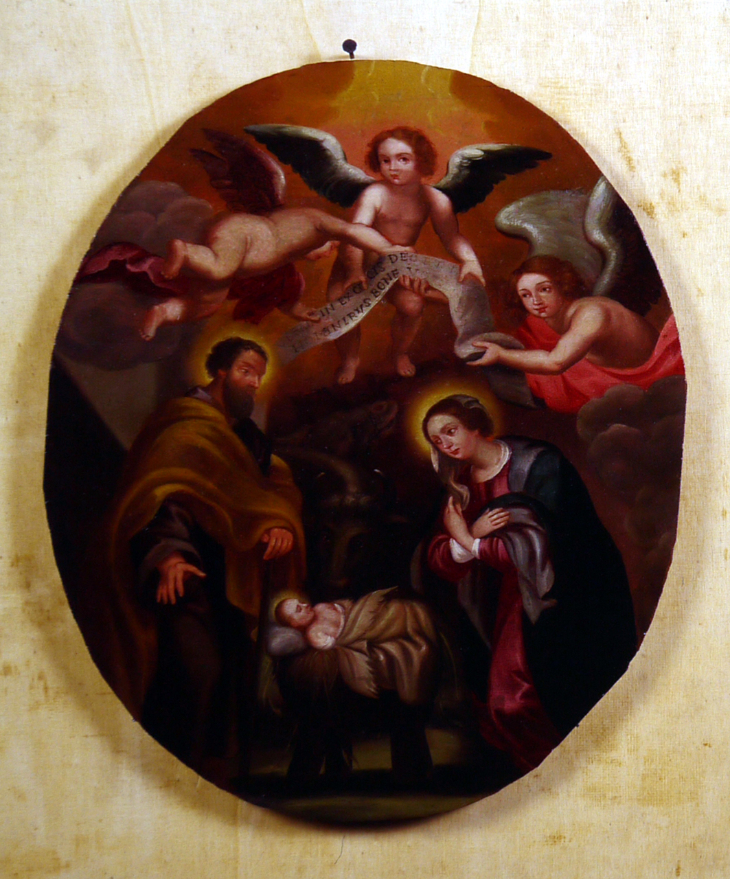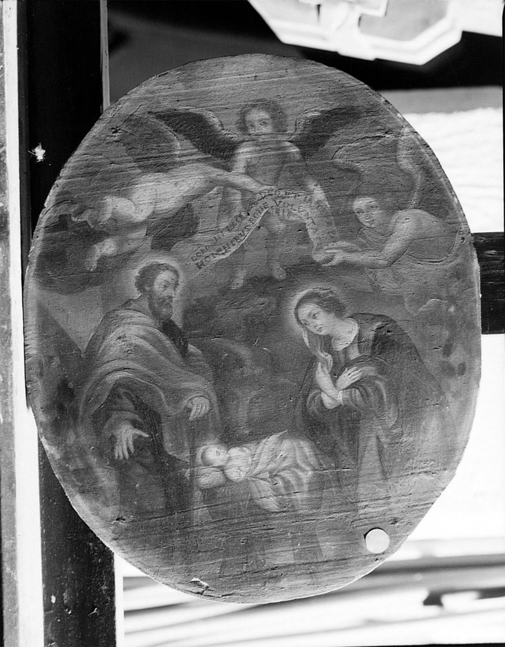 Al centro il Bambino appoggiato sul una culla (?), a sinistra San Giuseppe in piedi, a destra la Madonna semi inginocchiata. In alto angeli con un cartiglio