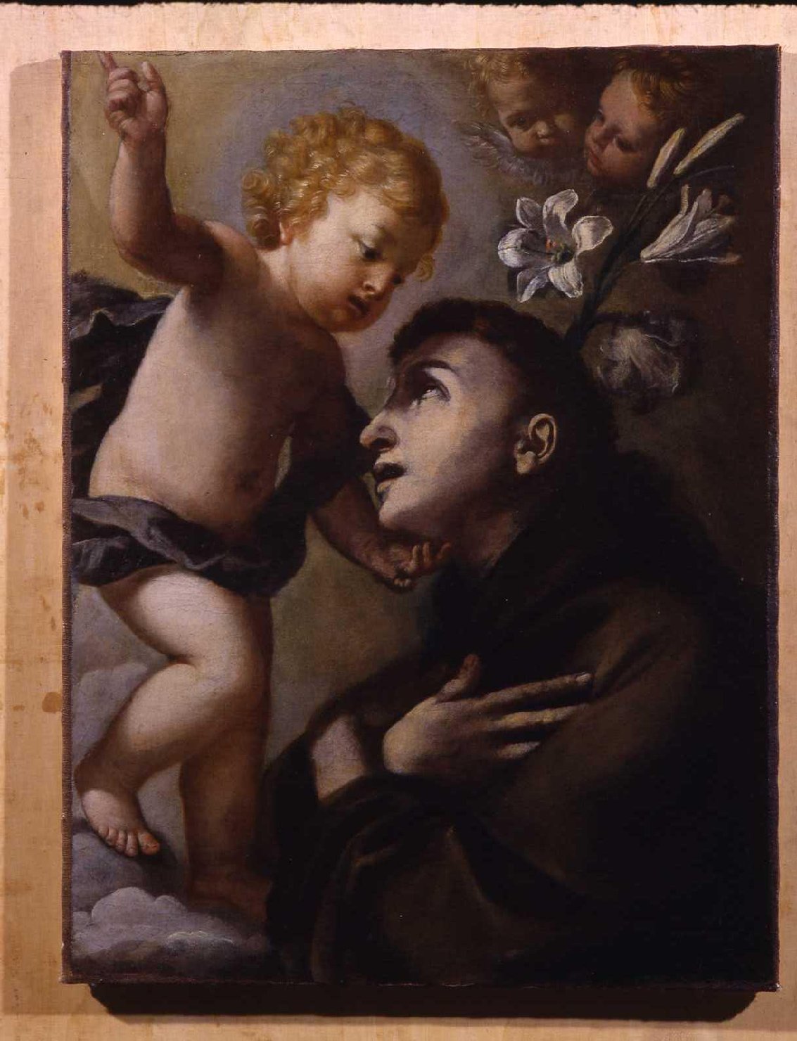 Mezzo busto di Sant'Antonio in atteggiamento orante, di profilo voltato verso la sinistra del dipinto, lo sguardo rivolto al Bambino che gli appare in piedi sulle nuvole con in mano un ramo di giglio