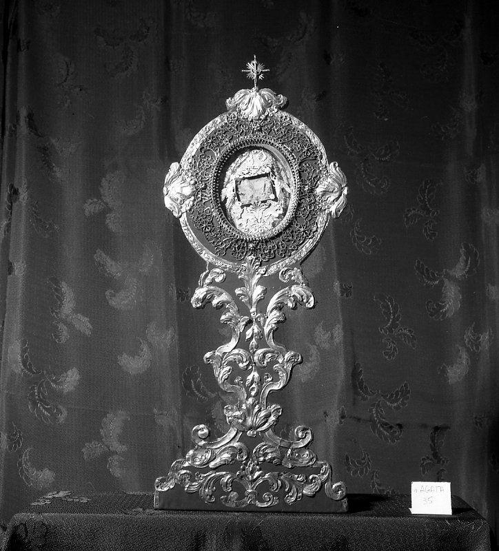 Base trapezoidale, stelo a vaso ornati di foglie d'acanto. Teca ovale su fondo di velluto rosso; cornice di filigrana fiorita. Ai lati e superiormente, grandi foglie d'acanto in lamina d'argento con crocefisso terminale aggiunto in epoca posteriore