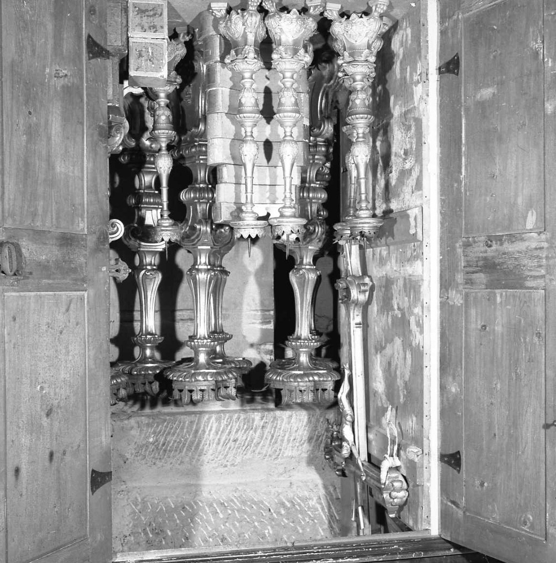 La base è triangolare con grandi fregi a foglie di acanto arricciate e volute; alla base è un agnello argentato; oltre ai candelieri fa parte della serie anche la croce d'altare dorata col Cristo argentato finemente scolpito