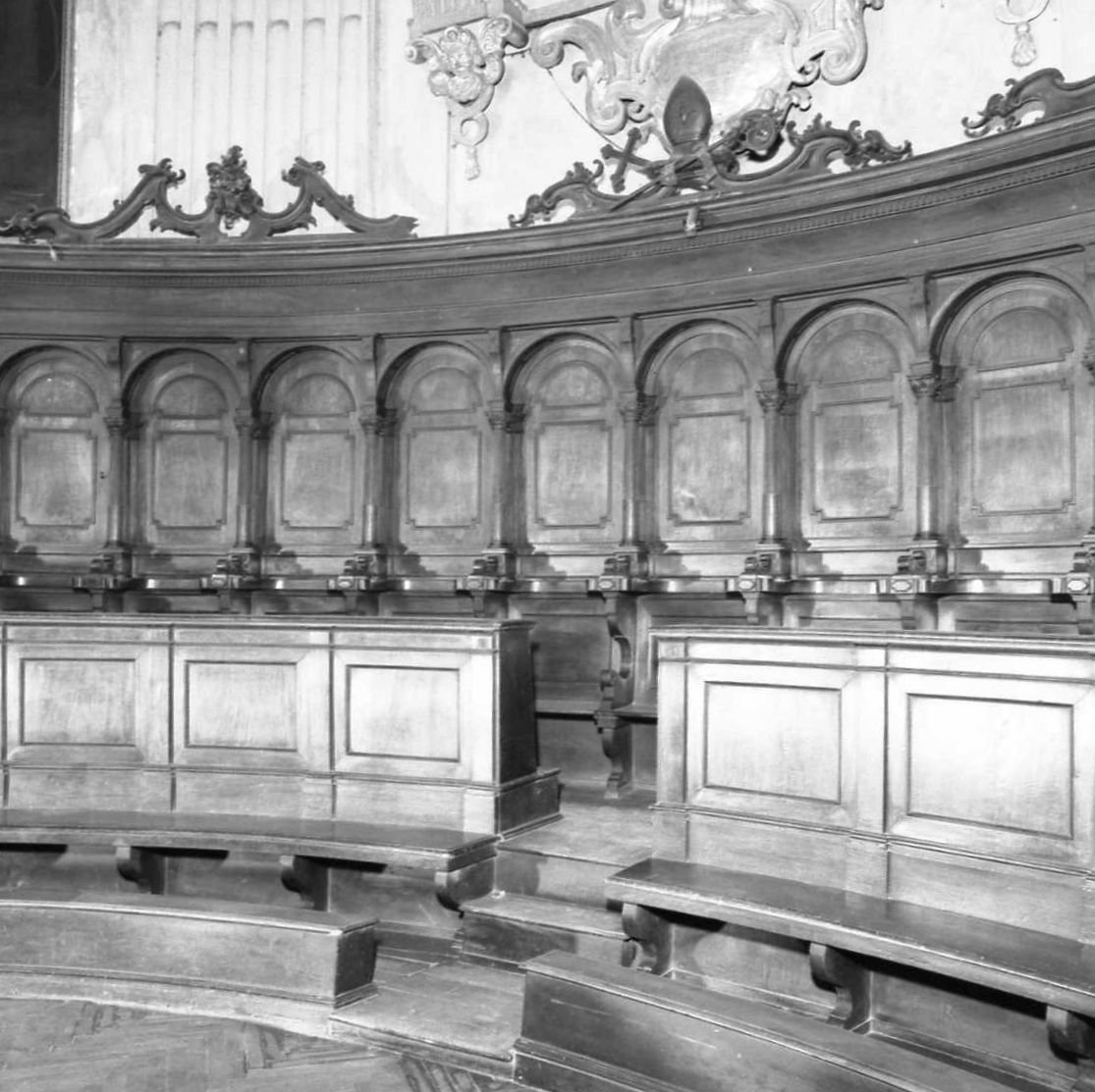 Composto di due ordini di scanni che, nel superiore, sono 31, in quello inferiore 22. I primi sono fiancheggiati da due colonnine scanalate che sorreggono un arco aggettante con al centro uno stemma a rilievo con mitra e pastorale; gli altri sono lisci. Lungo la fascia superiore sono fregi a foglie d'acanto in legno intagliato aggiunte nel XVIII secolo