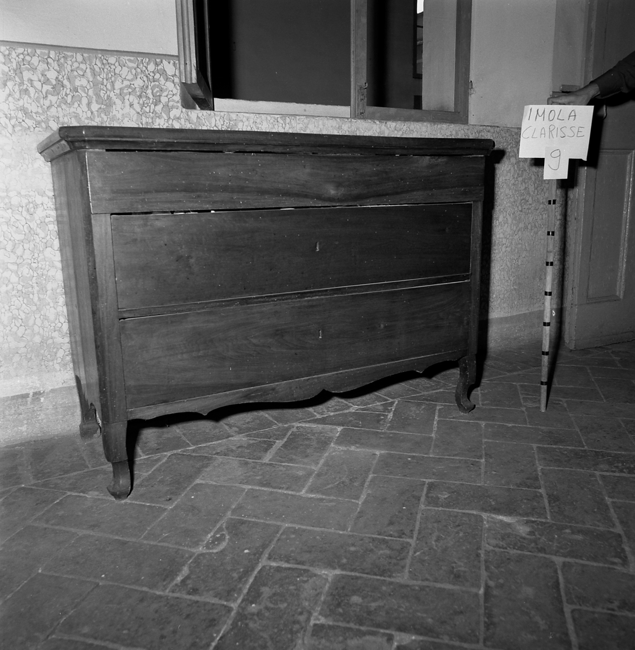 Piedi a riccio con sagomatura nella parte inferiore. Tre cassetti di cui quello superiore più stretto. Piano superiore con gli angoli smussati