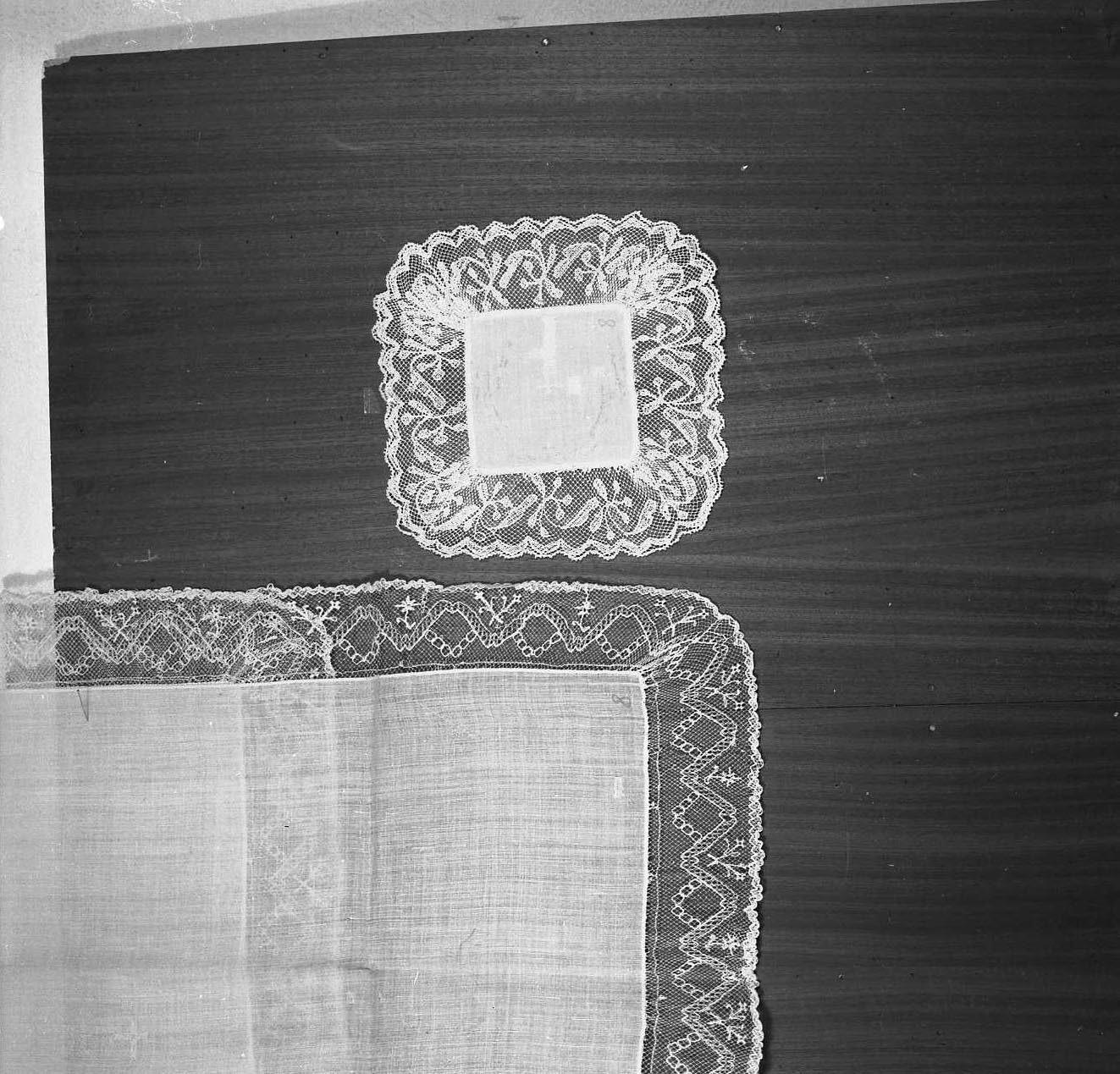 Il corporale è bordato da una trina ad ago su retino, con motivo a tralcio spezzato ad angolature; ogni settore così disegnato porta un fioretto alternato a due rametti incrociati; sul tralcio poggia una decorazione a festone costituita da sei quadretti, che forma così un rombo. Il bordo della palla, lavorato a fuselli, porta una decorazione sinuosa di ramoscelli con foglie a clava e bacche