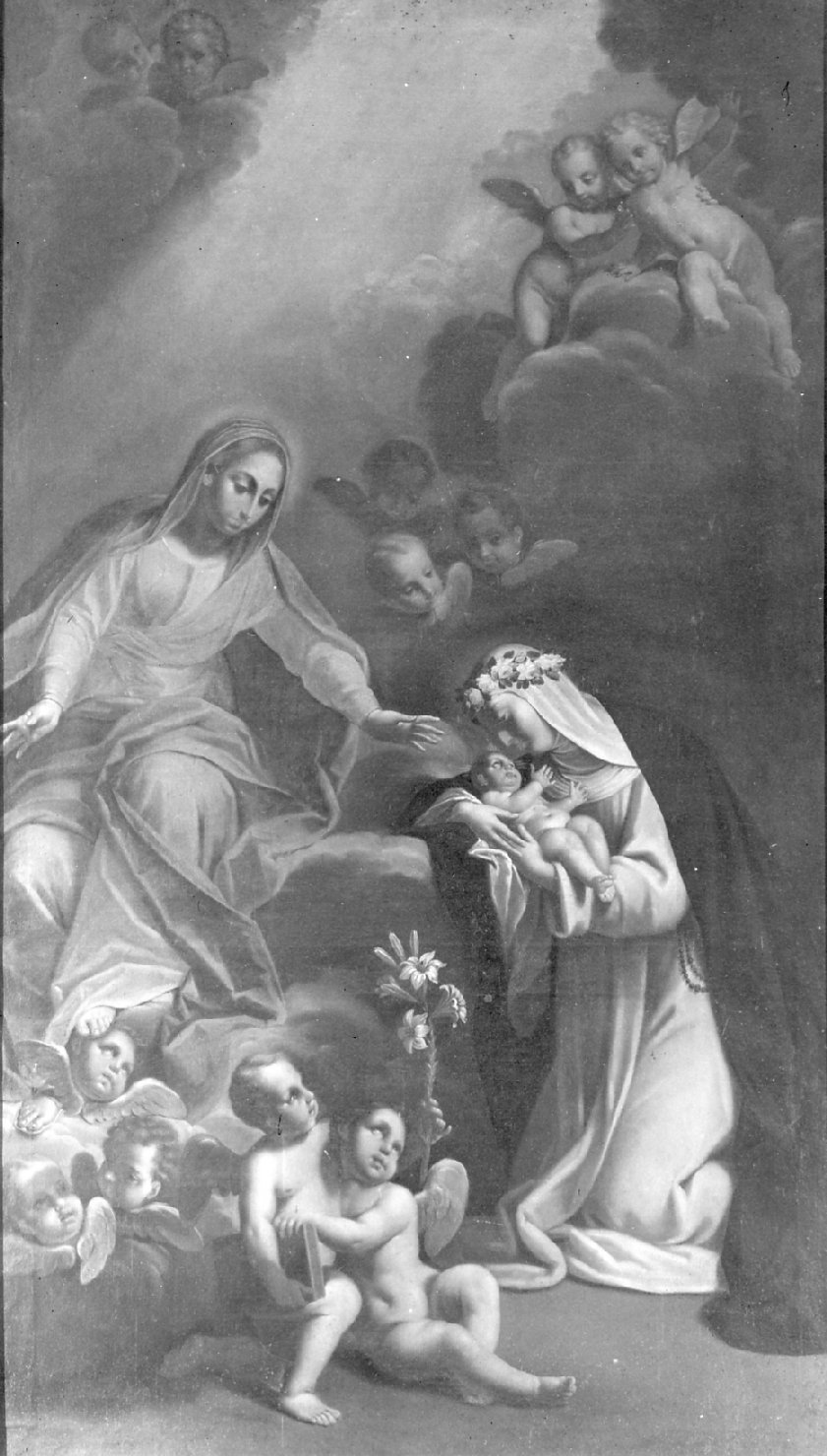 Dipinto di carattere tipicamente devozionale. La Vergine che si protende verso la Santa è vestita nel modo consueto. Il serto di rose sul capo della Santa caratterizza l'iconografia di S. Rosa da Lima