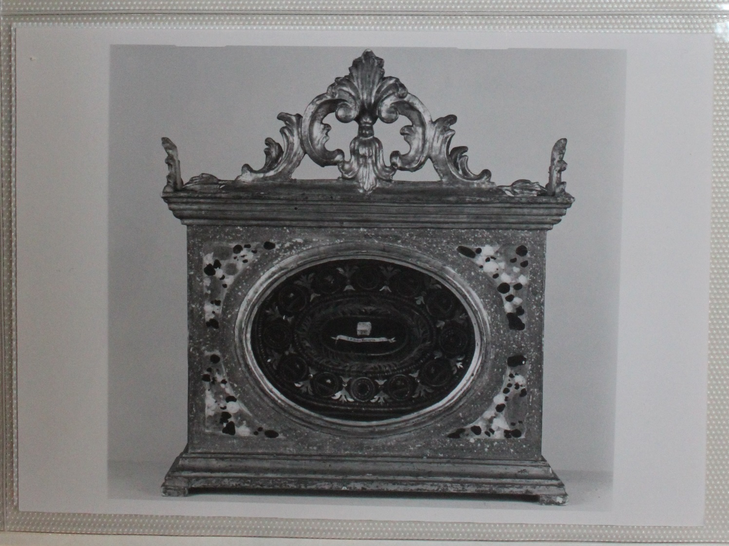 - NOTIZIE STORICO CRITICHE La coppia di reliquari a teca è citata nell'Indice Alfabetico delle SS. Reliquie possedute dal Sig. Giuseppe Maria Emiliani, datato 1832. Ciò consente di datarla ad un momento anteriore a questa data. Tenuto conto dei caratteri stilistici esibiti, è probabile che la cronologia sia contenuta nei primi tre decenni del XIX secolo, anche se il ductus degli intagli superiori appare ancora memore delle eleganze della cultura figurativa rococò; elemento, quest'ultimo, che potrebbe concorrere a stabilire una datazione di qualche tempo anteriore