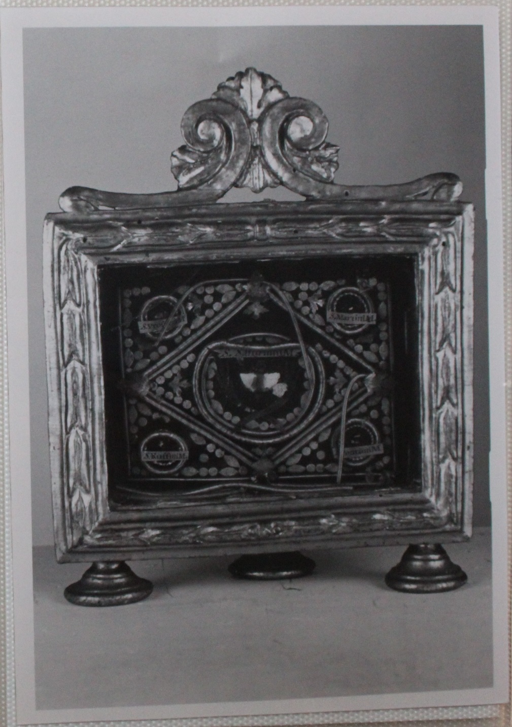 La teca quadrangolare si erge su tre piedistalli a pomelli e presenta una cornice a rilievo, sormontata da una cimasa intagliata, costituita da due volute raccordate al centro. All'interno della teca il decoro è formato con una spirale a molla metallica. Uno dei due oggetti contiene le reliquie dei martiri Prospero, Martino, Saturnino, Rufino e Ponziano