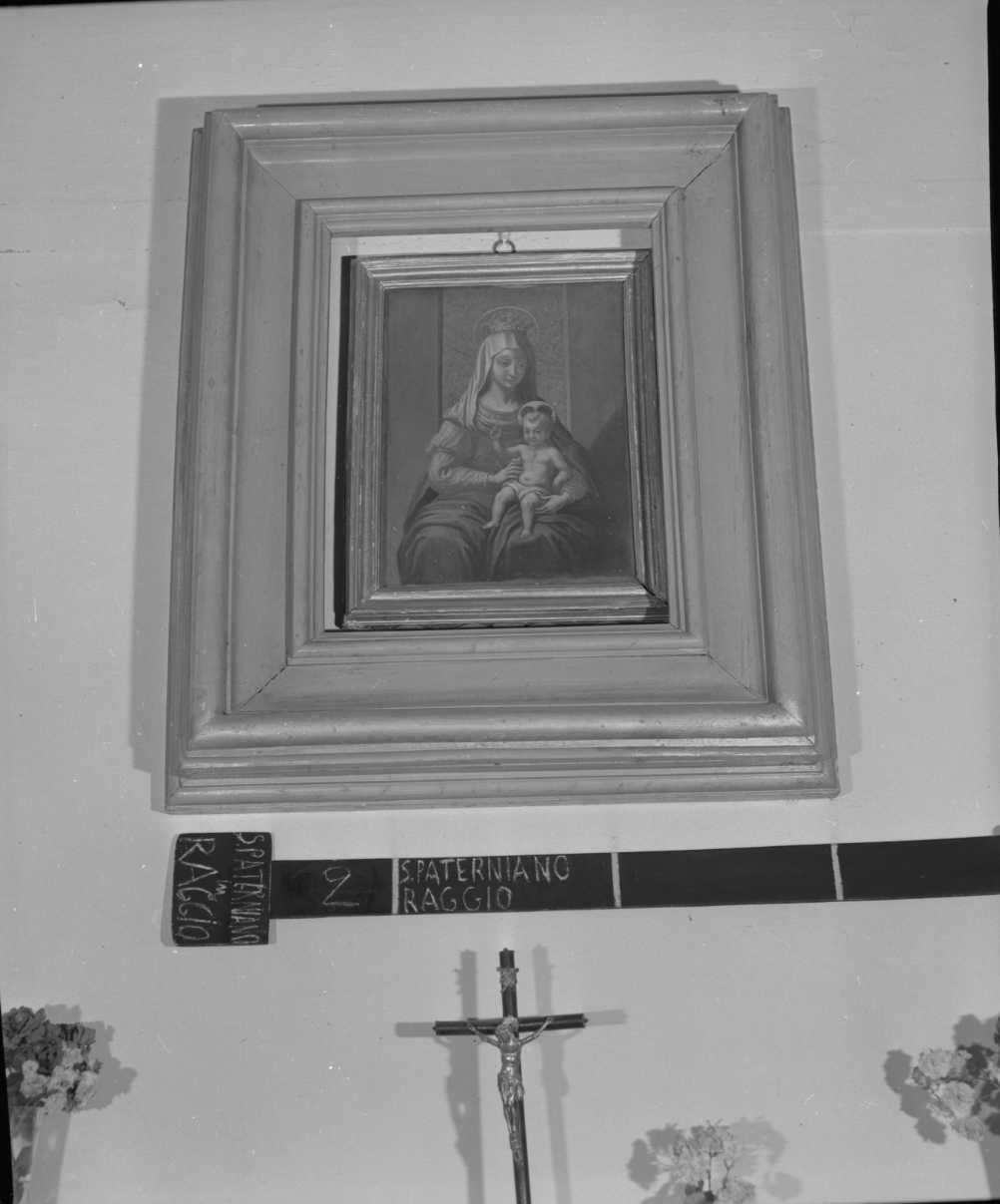 La Vergine è raffigurata seduta in trono col Bambino in grembo; il dossale del trono è a tenda di broccato, l'aureola del Bimbo crociata in rosso. Cornicetta dorata entro nicchione ligneo