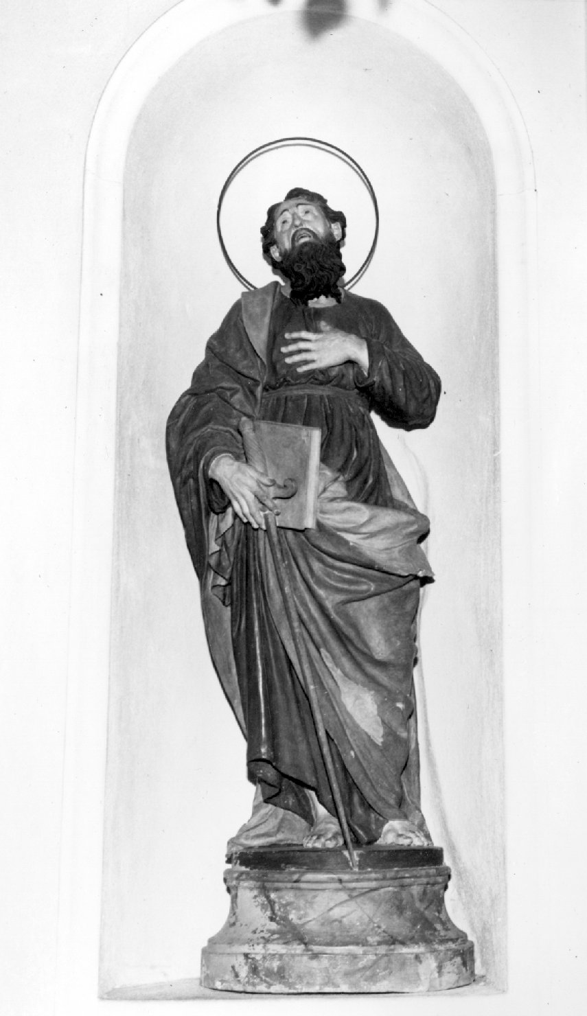 Figura intera in piedi, in abito coperto da mantello ampiamente drappeggiato, il capo volto in alto; la mano sinistra è al petto, la destra regge contro il corpo la spada e un libro chiuso. Poggia su base ovale, dipinta a finto marmo
