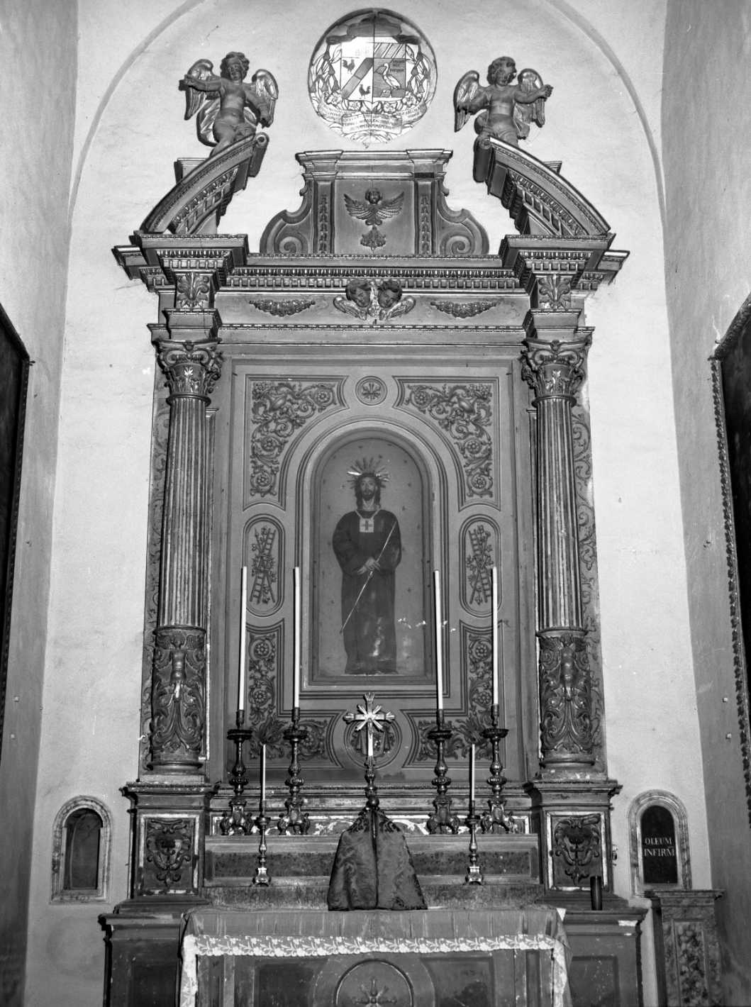 Posta sulla mensa dell'altare. Due colonne, una per lato, con capitelli compositi , scanalate nella parte superiore e decorate da grottesche di fogliami con putti - cariatidi alati nella parte inferiore. Negli zoccoli delle colonne vi sono, uno per parte, due stemmi della famiglia Papini. Il fregio dell'architrave vede al centro due teste di cherubini con a lato due festoni. In corrispondenza dei capitelli delle colonne, due elementi aggettanti che recano motivi gigliacei. Frontone spezzato con cornici curve e motivi geometrici su cui poggiano due angioletti a tutto tondo. Al centro una specchiatura quadrata con una testina alata ai cui lati due lesene con decorazioni floreali verticali con capitelli modanati e due ampie volute ai lati. La parte centrale dell'ancona intorno alla nicchia che racchiude la statua è decorata da disegni floreali monocromi giallo - marroni su fondo grigio. Quattro medaglioni, due ovali laterali e due circolari centrali, completano la decorazione: due ovali recano i simboli della Passione, i due circolari recano, quello superiore, i chiodi e, quello inferiore, il volto di Cristo