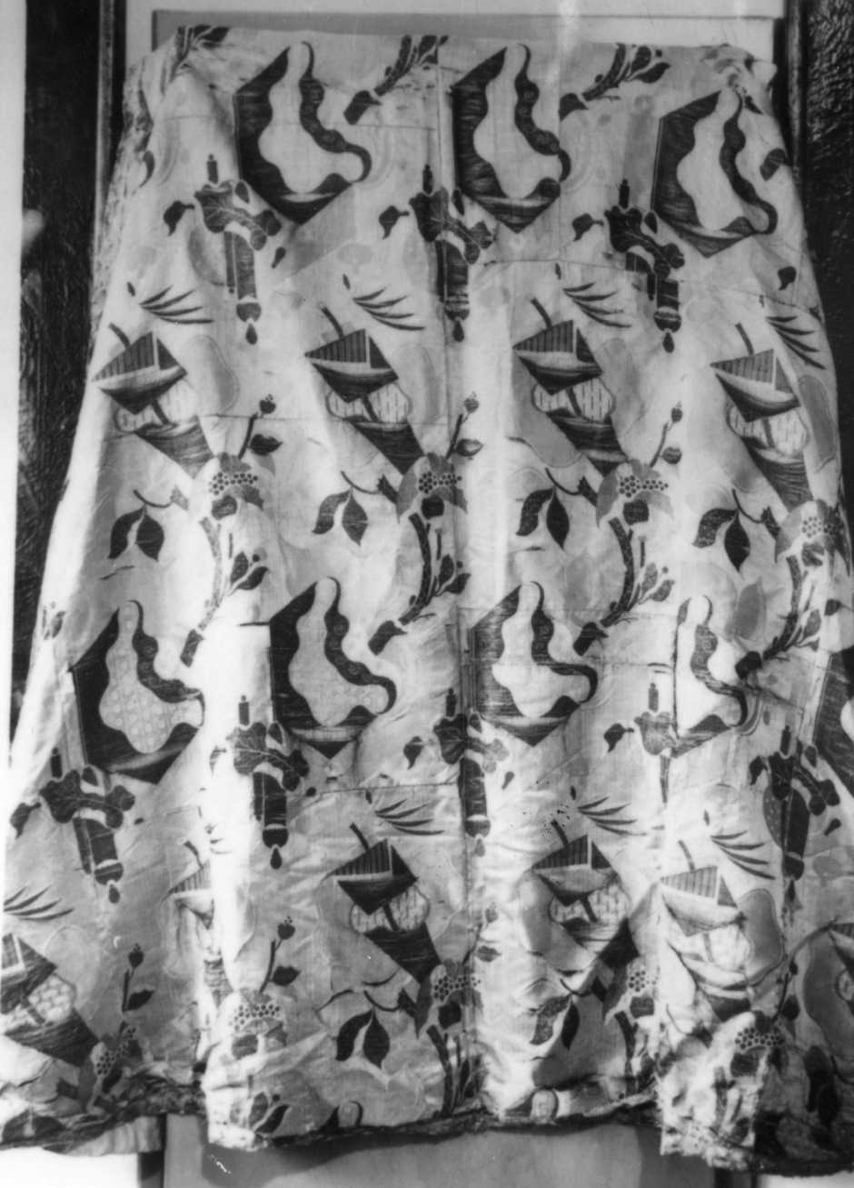 - NOTIZIE STORICO CRITICHE Manto processionale per la residenza della Vergine. Rarissimo esemplare di tessuto a decorazione astratta, simile a quelli pubblicati da Podreider/ Serra in: Catalogo Mostra del Tessile, nn. 204- 206- 207. Il manto faceva parte, nel 1932, di un parato completato da un baldacchino di identico tessuto; nel 1967 era stata perduta la parte lignea del baldacchino, mentre la parte serica non è recuperabile dopo il 1974 (epoca della morte dell'arciprete mons. Babini). Dal 1975 in deposito presso la chiesa dell'Assunta di Solarolo