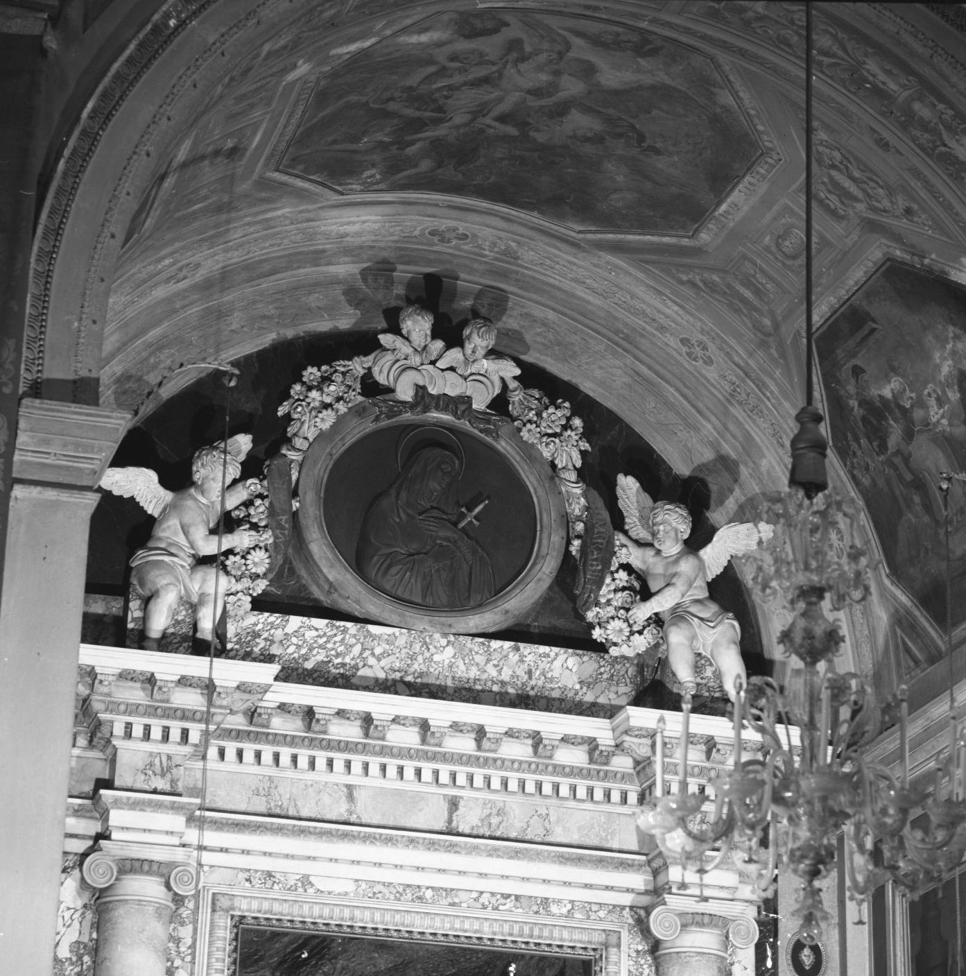 Mezza figura della Vergine volta di profilo verso destra, con le mani incrociate sul petto; è interamente drappeggiata nel manto e il cuore è trafitto da una spada di metallo dorato. Cornice rotonda in marmo giallo con nodo al sommo, sopra il quale poggiano su nubi due testine di cherubini, dai quali si dipartono due grossi festoni floreali ai quali si appoggiano due angioletti a tutto tondo, seduti, simmetricamente opposti, alle estremità dell'ancona