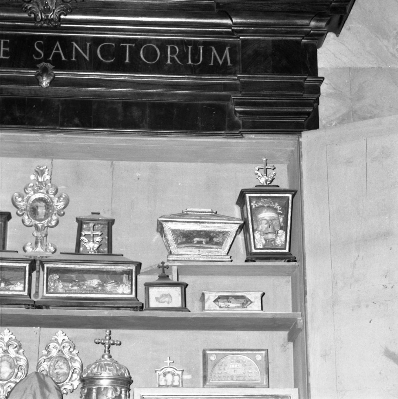 A cassetta a tronco di piramide rovesciato, su quattro peducci a bulbo dorati. Cornice superiore aggettante e copertura cuspidata. Tre aperture a sagomatura trapezoidale (fronte e lati) sono vetrate. Tutte le cornici sono fittamente decorate a listelli di specchio, con motivi a cordoncino tortile di raccordo