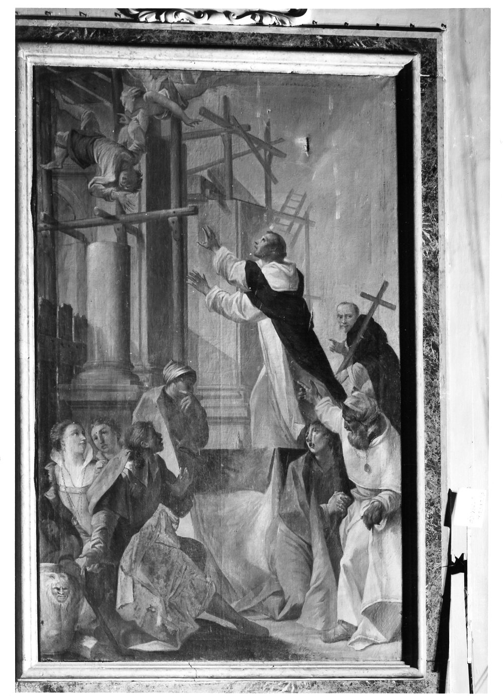 Il Santo, in piedi, volto di profilo verso sinistra, volge le mani verso un giovane che sta precipitando da una impalcatura in legno che circonda un edificio di cui si vedono pilastri e colonne. In basso alcuni astanti; alle spalle del santo un altro monaco con una croce