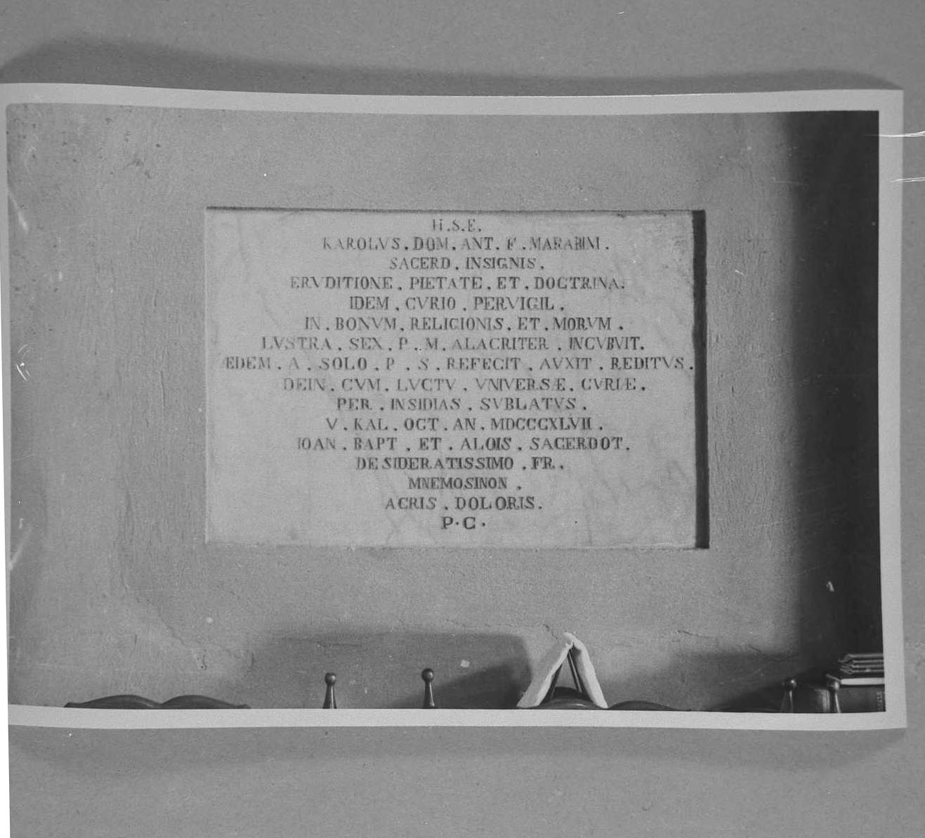 - ISCRIZIONI H.S.E./ KAROLVS.DOM.ANT.F.MARABINI/ SACERD.INSIGNIS./ ERVDITIONE.PIETATE.ET.DOCTRINA./ IDEM CVRIO.PERVGIL./ IN. BONVM.RELIGIONIS.ET.MORVM./ LVSTRA.SEX.P.M.ALACRITER.INCVBVIT./ EDE.A.SOLO.P.S.REFECIT.AVXIT.REDITVS./ DEIN.CVM.LVCTV.VNIVERSAE.CVRIAE./ PER.INSIDIAS.SVBLATVS./ V.KAL.OCT.AN.MDCCCXLVVI./ IOAN.BAPT.ET.ALOIS.SACERTOT./ DESIDERATISSIMO. FR./ MNEMOSINON./ ACRIS.DOLORIS./ P.C - lettere capitali -