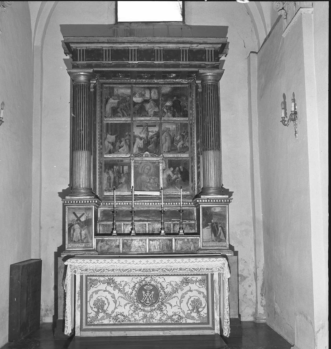 Due alte basi parallelepipede reggono due grosse colonne scanalate, per un terzo dorate e per due terzi dipinte, addossate a lesene piatte; in basso, sotto il toro d'imposta delle colonne, corre una cornicetta a dentelli. Trabeazione a triglifi sovrastata da cornicetta breveemente aggettante. L'ancona inquadra una pala racchiudente tre file di dipinti; ogni fila è divisa in tre scomparti per un totale di nove dipinti: otto sono storie di San Bernardo di Chiaravalle, la nona (nella prima fila in basso) è l'immagine della "Madonna della febbre". Il fronte e un lato delle basi delle colonne portano altri quattro dipinti e i due gradini d'altare, contenuti alla base dell'ancona, sono a loro volta divisi in quattro scomparti per un totale di otto rappresentazioni, ancona inerenti a san Bernardo (per tutti i dipinti si vedano le schede relative)