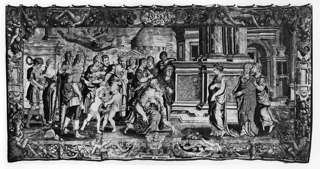 - NOTIZIE STORICO CRITICHE Questo arazzo è un pezzo assai importante per la ricostruzione dell'attività del fiammingo Giovanni Stradano, operoso in Palazzo Vecchio e nelle ville medicee fra il 1556 e il 1575. La composizione si rifà ad un'incisione in rame della serie di Psiche del "Maestro del Dado". Nel repertorio delle bordure riappare qualche ricordo di Francesco Salviati. Il cartone per l'arazzo risale agli anni 1561/1562 e per tecnica e composizione è assai vicino alla prima serie con Storie di David, realizzata dallo Stradano negli stessi anni per la camera di Francesco in Palazzo Vecchio, nella bottega di Benedetto Squilli e Giovanni Battista Sconditi