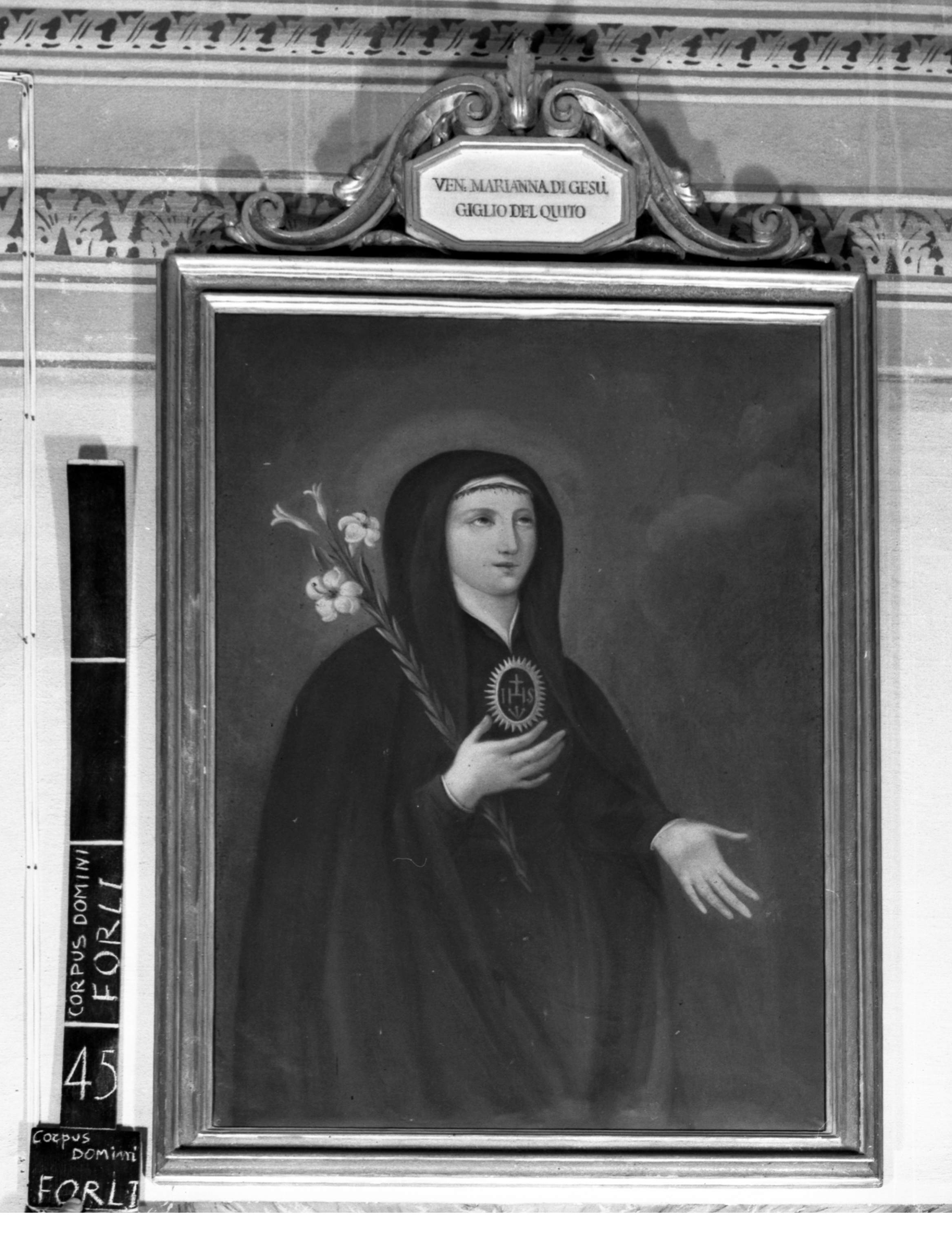 - NOTIZIE STORICO CRITICHE Il dipinto raffigura Marianna di Gesù de Paredes (Quito, 1618-1645), terziara francescana di origine equadoriana, dedita alla penitenza e missionaria, beatificata da Pio IX nel 1853 e canonizzata nel 1950. La religiosa è raffigurata con l'aureola, elemento che indica come l'opera sia stata realizzata non prima della data di beatificazione. Anche la cornice è di gusto ottocentesco. Il giglio è un suo attributo specifico e il monogramma cristologico attesta la devozione della religiosa verso Gesù. I caratteri della sua vita dovettero fornire un esempio alle monache forlivesi, che giustificano la commissione dell'opera in predicato